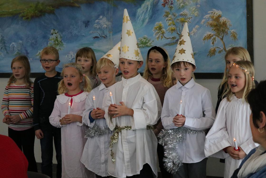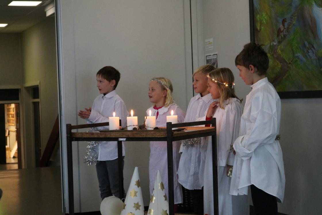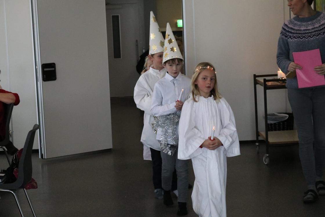2. og 3.klasse kom syngende inn til oss som lucia. Det er noe me gleder oss til kvart år. 2.klasse var igjen for å framføre litt meir som dei og skulle visa på bygdakvelden. Kjempeflinke var dei.
