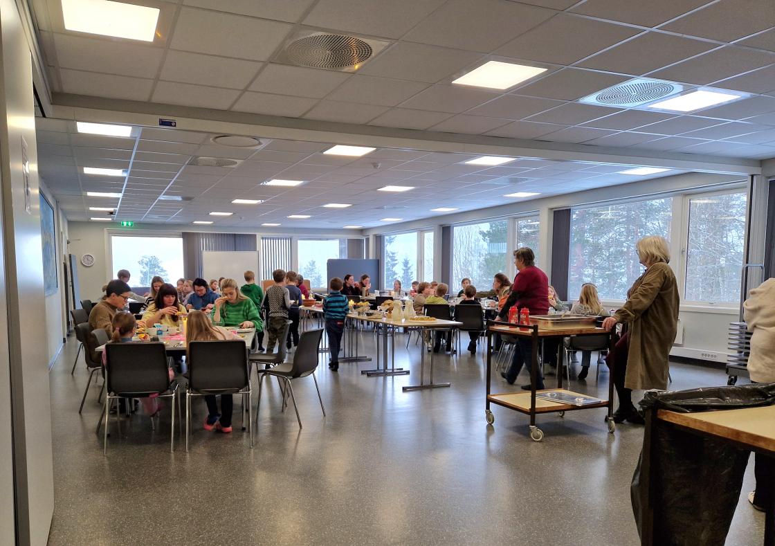 Gunvor ønska alle velkomen og elevane sang for maten. 1.klasse fekk forsyna seg først saman med hjelparane sine. Alle koste seg både elevar og lærerne. Etter matøkt rydda elevane etter seg. Flinke og rolige barn i Skare skule.