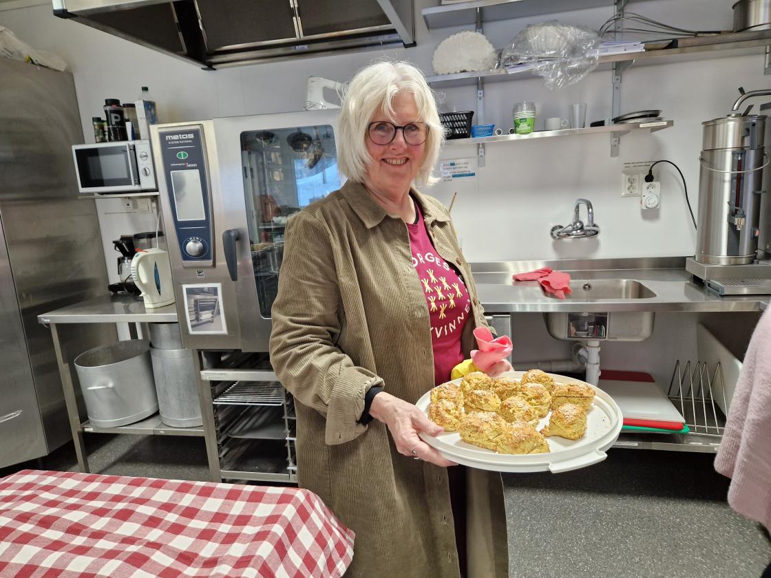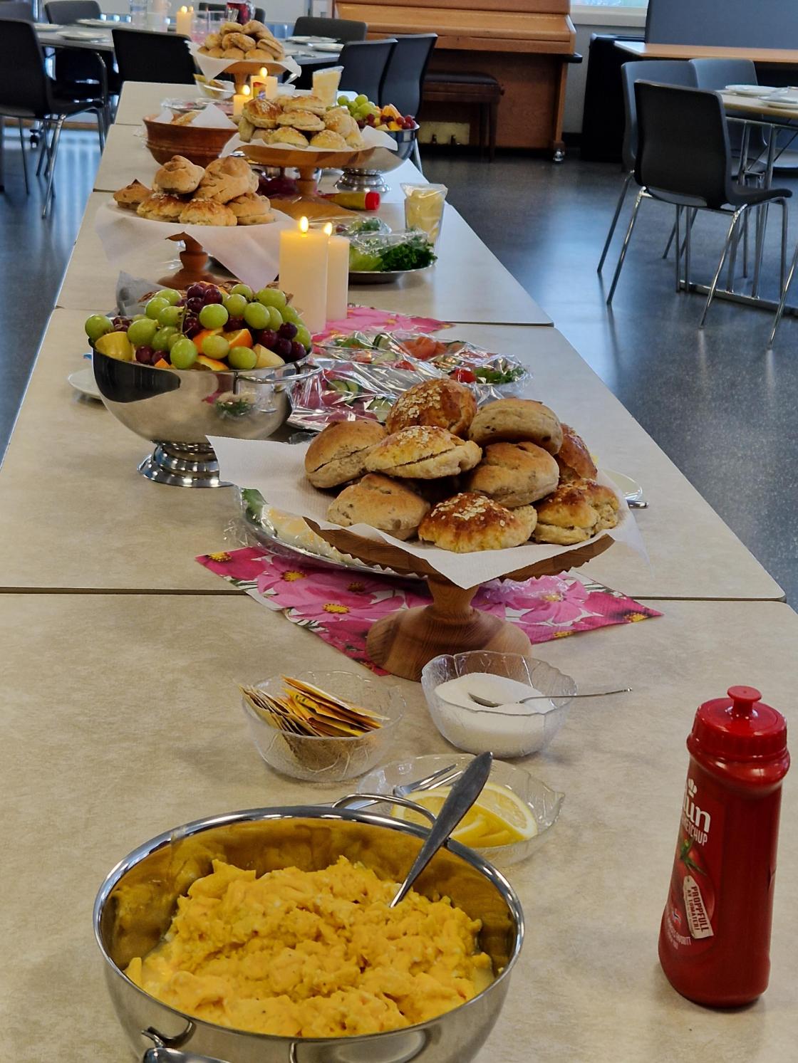 17 medlemmer møtte på grendahuset kl.0900. Alle tok til å jobba med ein gang. Bord skulle settes på plass. Fater skulle pyntes med tomater, agurk, salat og kjøttpålegg. Eggerøre lages, egg kokes, blekksprutpølser steikes. Havreboller, brødskiver og knekkebrød kom på plass.