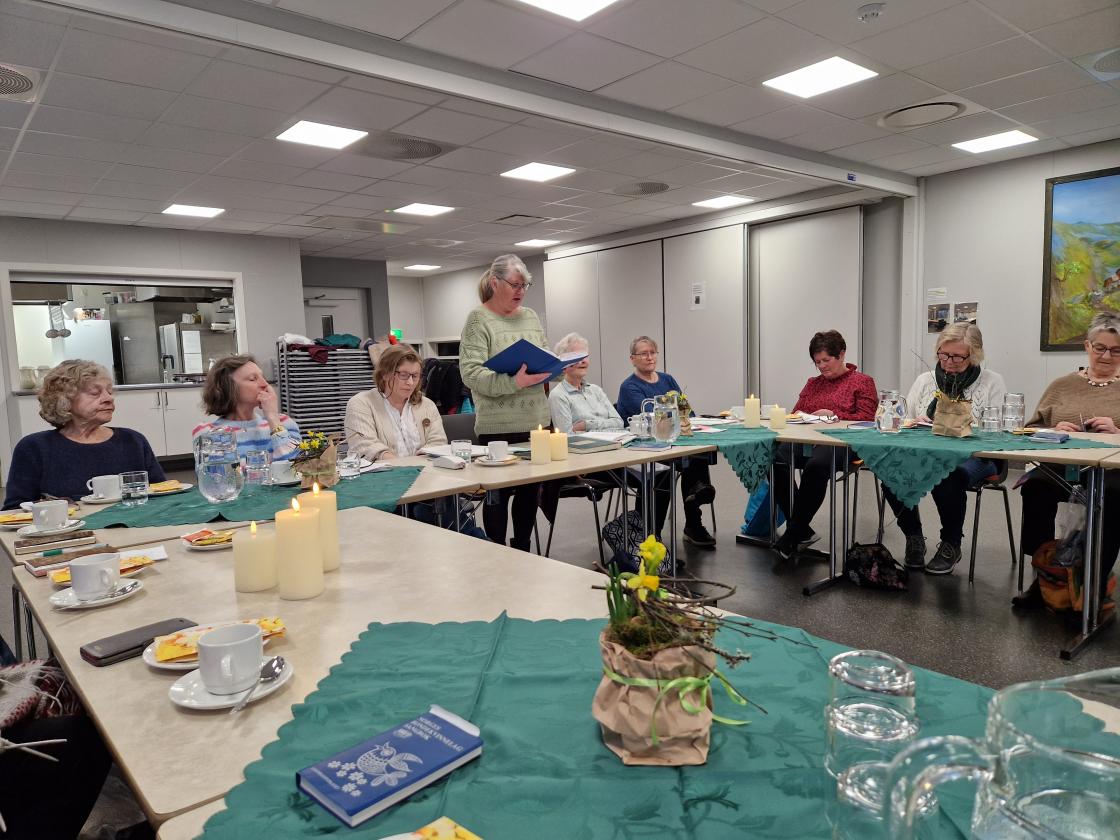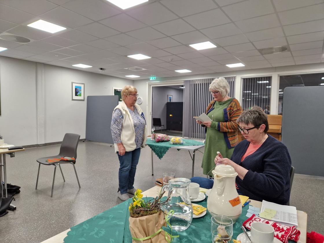 Det møtte 22 medlemmer. Borda var fint påskepynta. Gunvor ønskte velkomen og referat vart lest av Kari og godkjent.