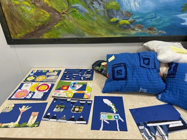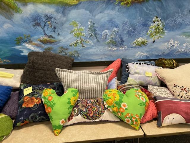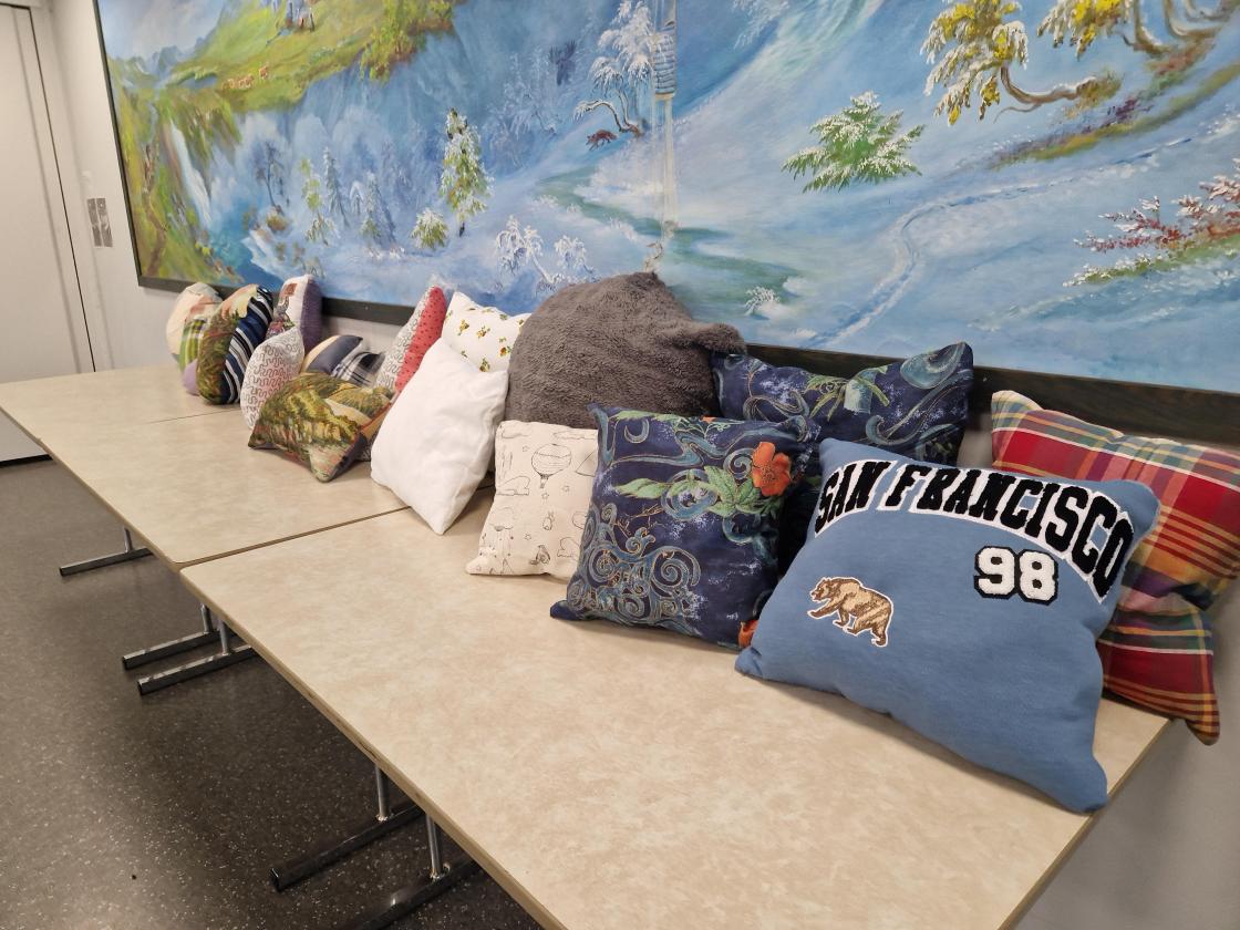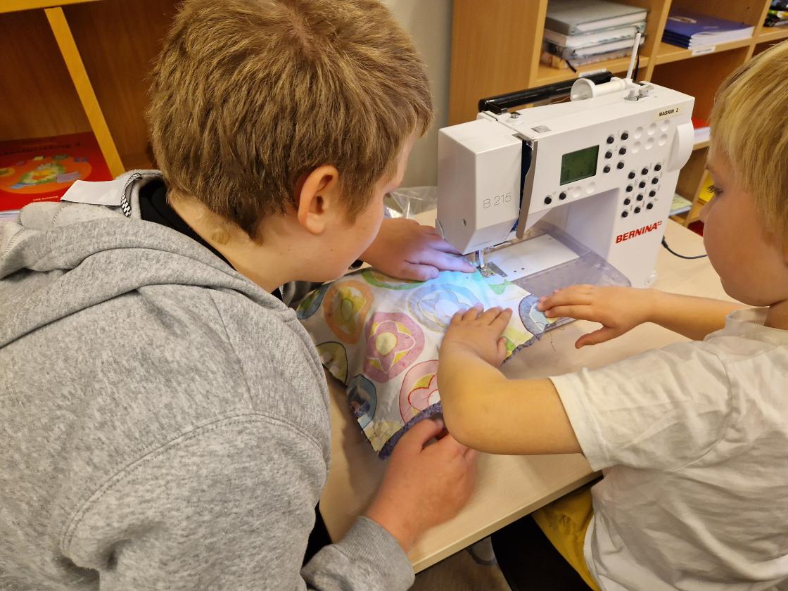 I sygruppa hjalp me elevane med å sy på symaskin. Elevane hadde på forhand samla inn stoffer. Gjenbruk av dukar, gardiner og andre stoff. Dei forma mønster og klipte ut. Nåla og tråkla alt klart til sying. Maskinsaum, god vatt inni, og det blei mange flotte og fargerike puter.