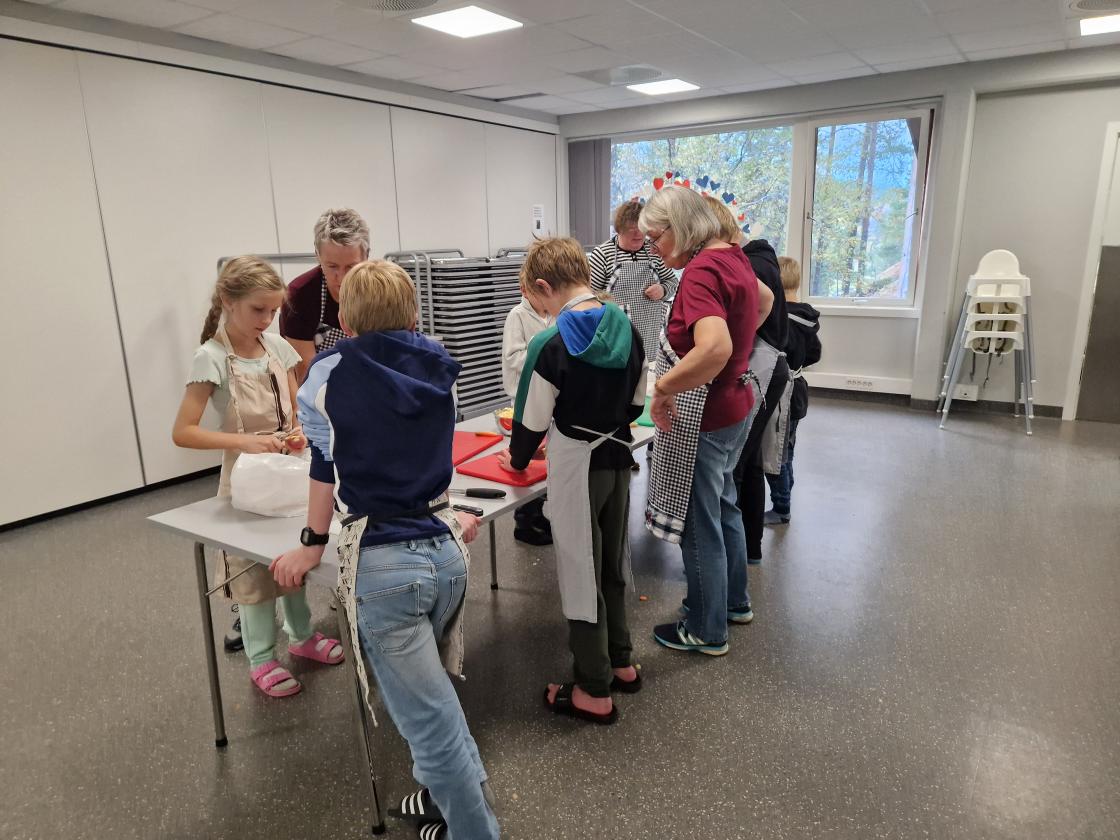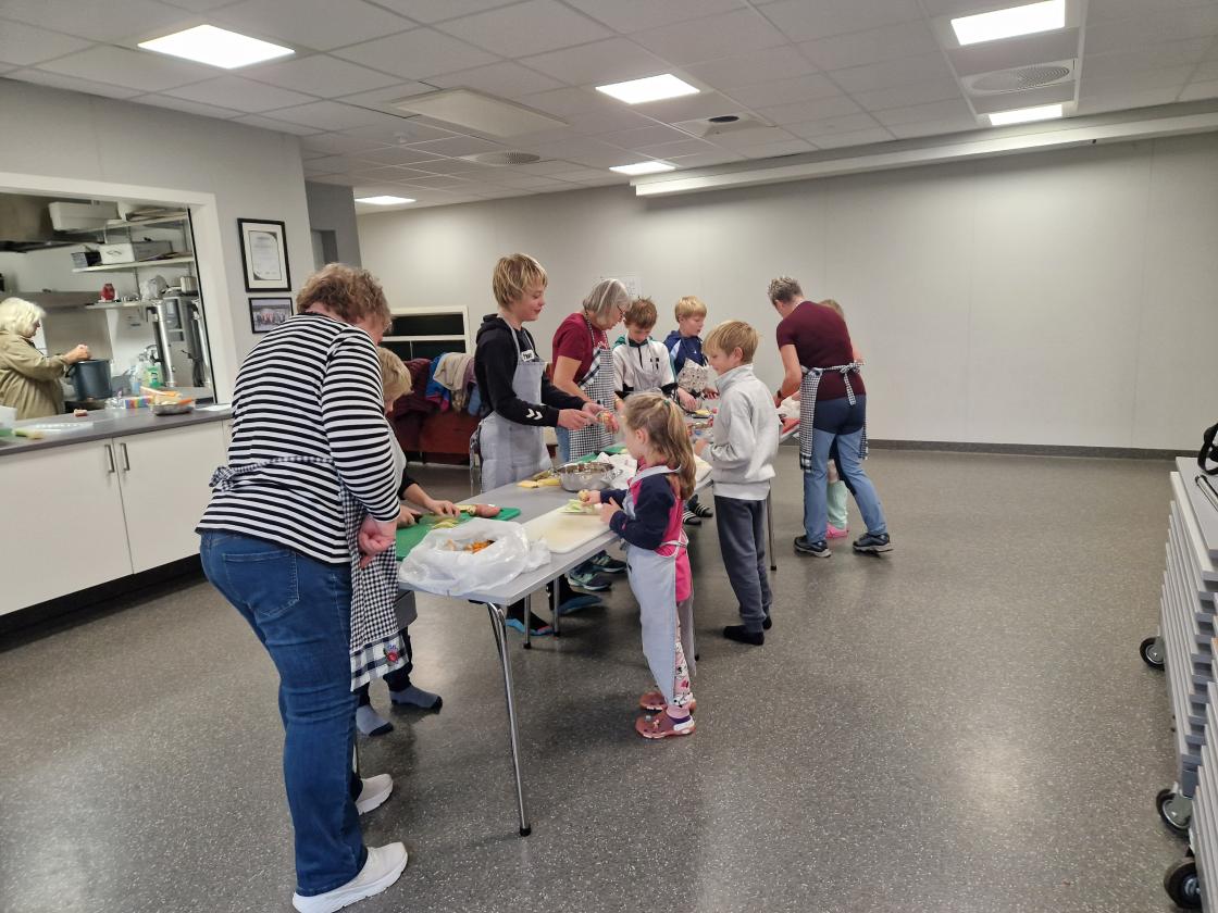 Ein gjeng av oss var til hjelp på kjøken. Me gjorde klar grønsakene slik at elevane kunne skrella og skjæra dei opp i passe bitar. Flinke og ivrige var dei.