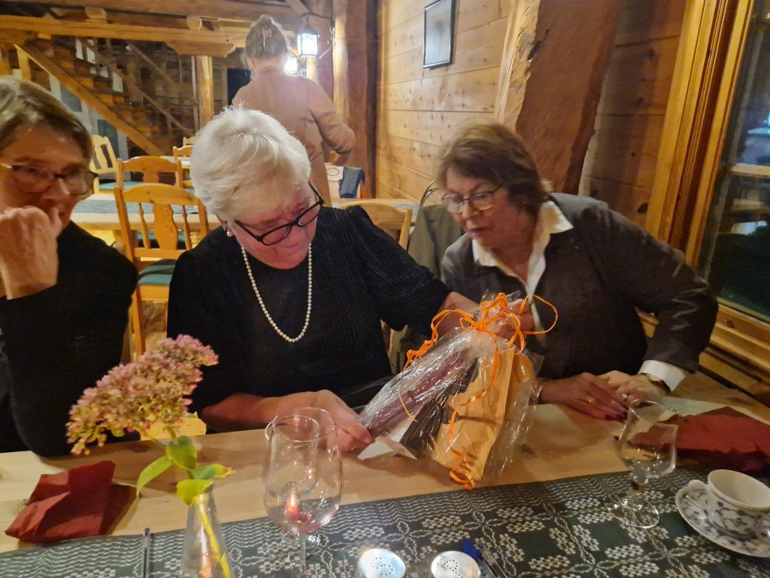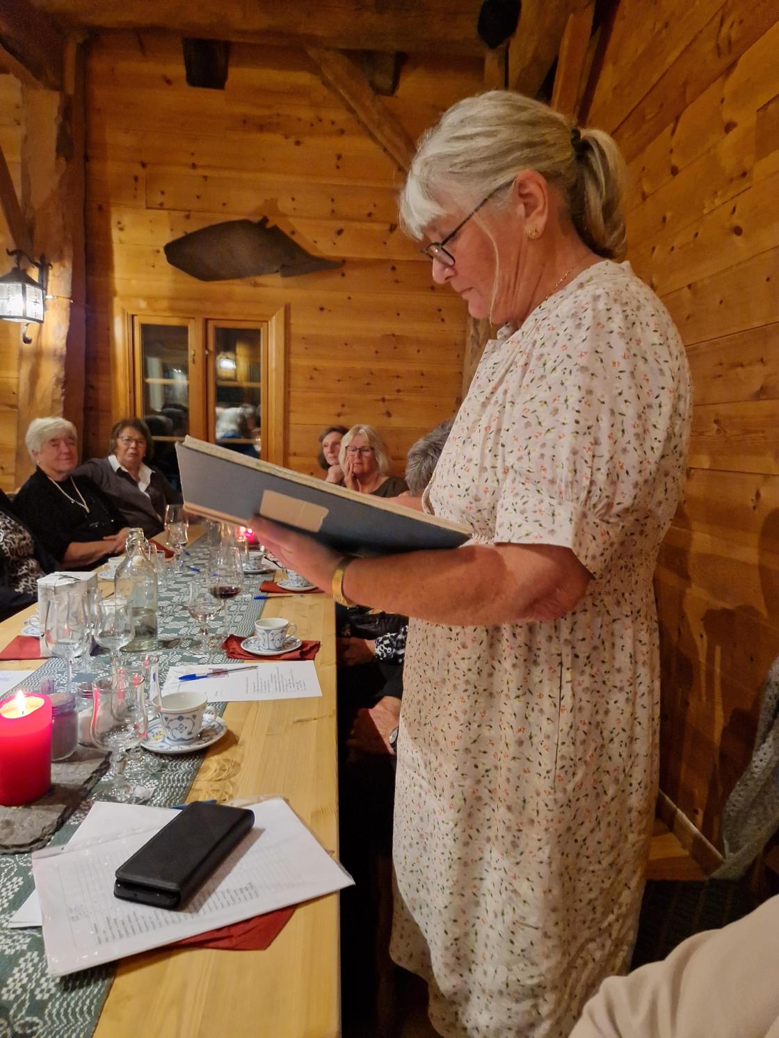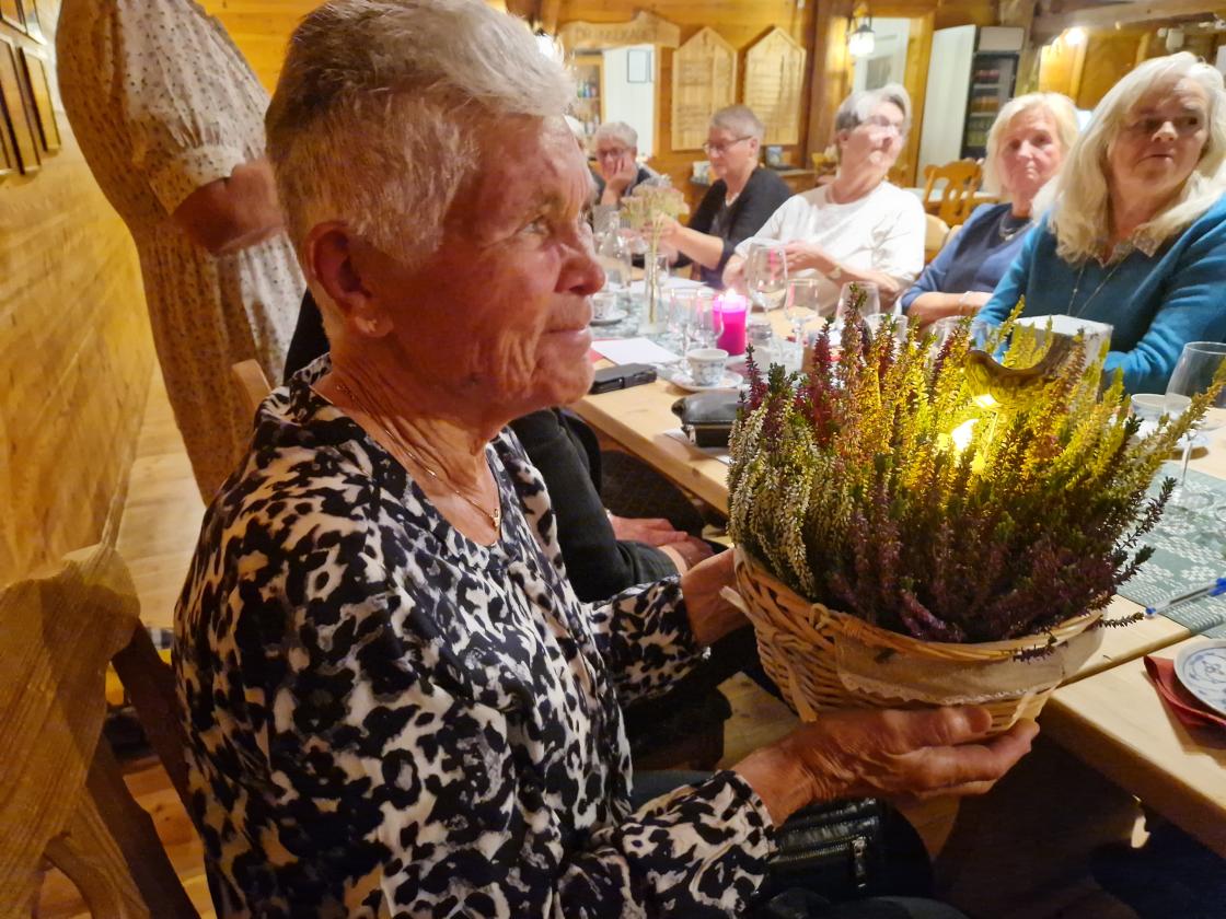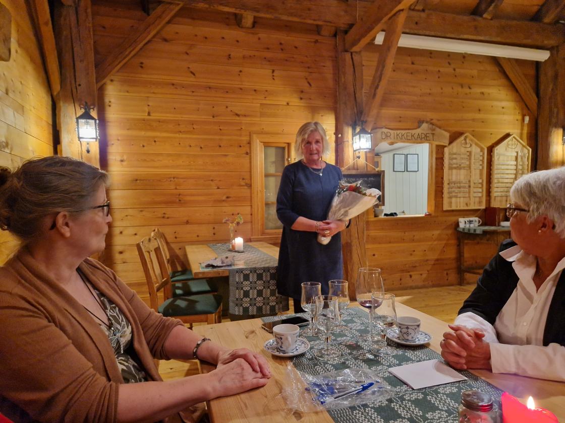 Gunvor ønsket velkommen. Mellom hovedrett og dessert leste Kari fra Framsteg - lagsbladet vårt. Det var oppsummering av 75 års historie fra starten og til idag. Det viste et bygdekvinnelag som har bidratt med mye forskjellig i bygda. I løpet av disse 75 årene har det kun vært 12 lederer. Margot og Gunvor har begge vært ledere i 20 år. Gunvor fikk overrakt blomster. Margot kunne dessverre ikke være med, men Tone og Kari ville ta turen på søndag med blomster og kake.