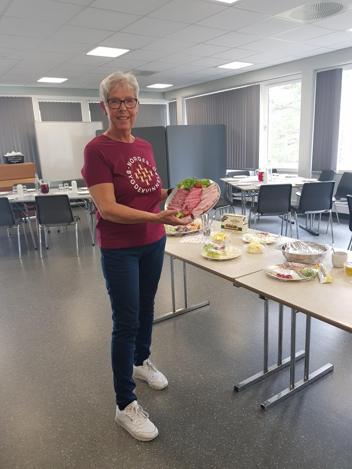 18 bygdelagskvinner møtte kl 09.00 og sette i gong. Havrebollar hadde me baka heime. Me kokte egg, laga eggerøre, pynta store påleggsfat med ost og skinke ,laks og salat, spretne småpylser og ellers alt som er godt å finne på eit bufebord.