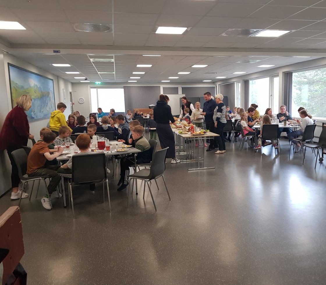 Det var lett å sjå at både store og små koste seg med den gode maten. Det er ei fin oppleving for oss bygdekvinner å laga til slik og sjå at det vert sett pris på. . Det blei sunge skikkeleg for maten og rektor takka og roste oss for stunda.