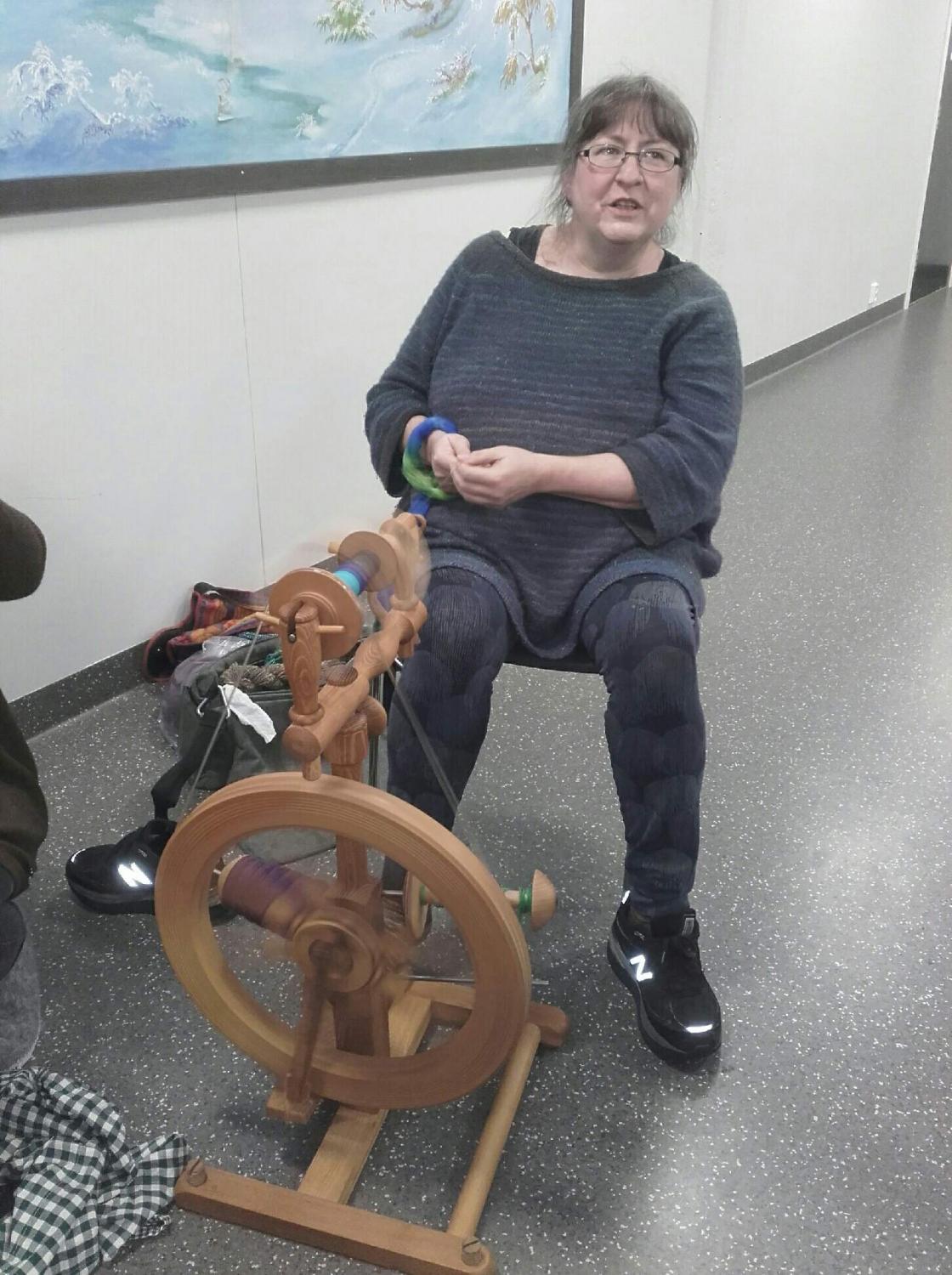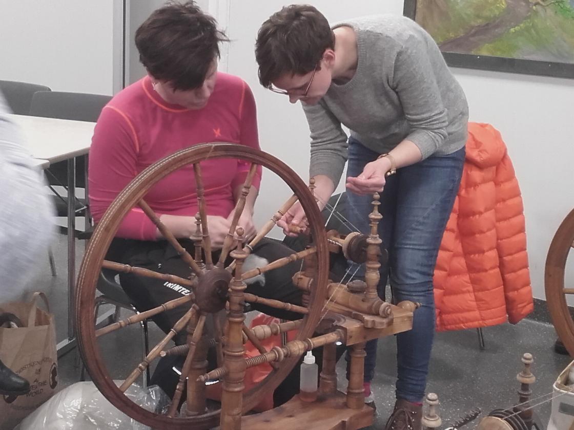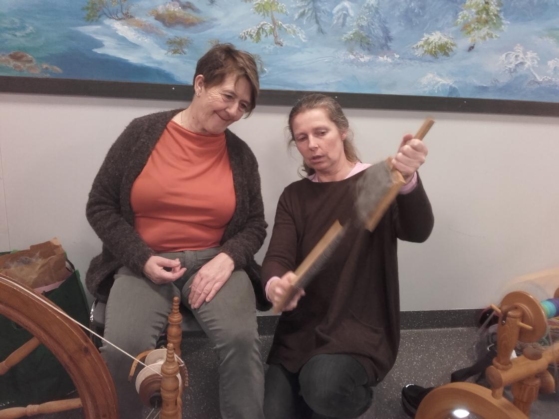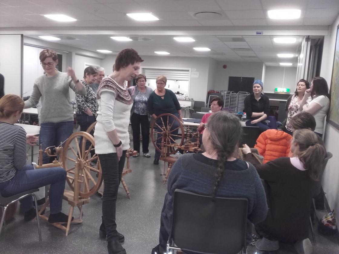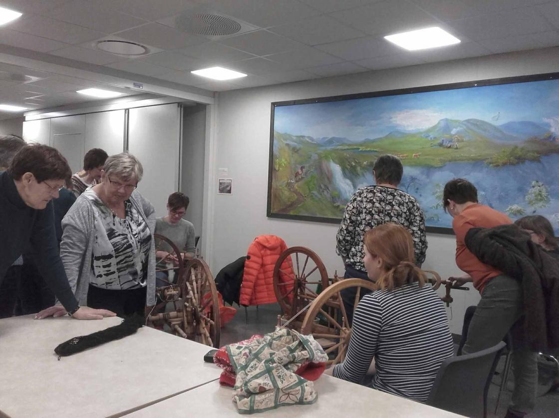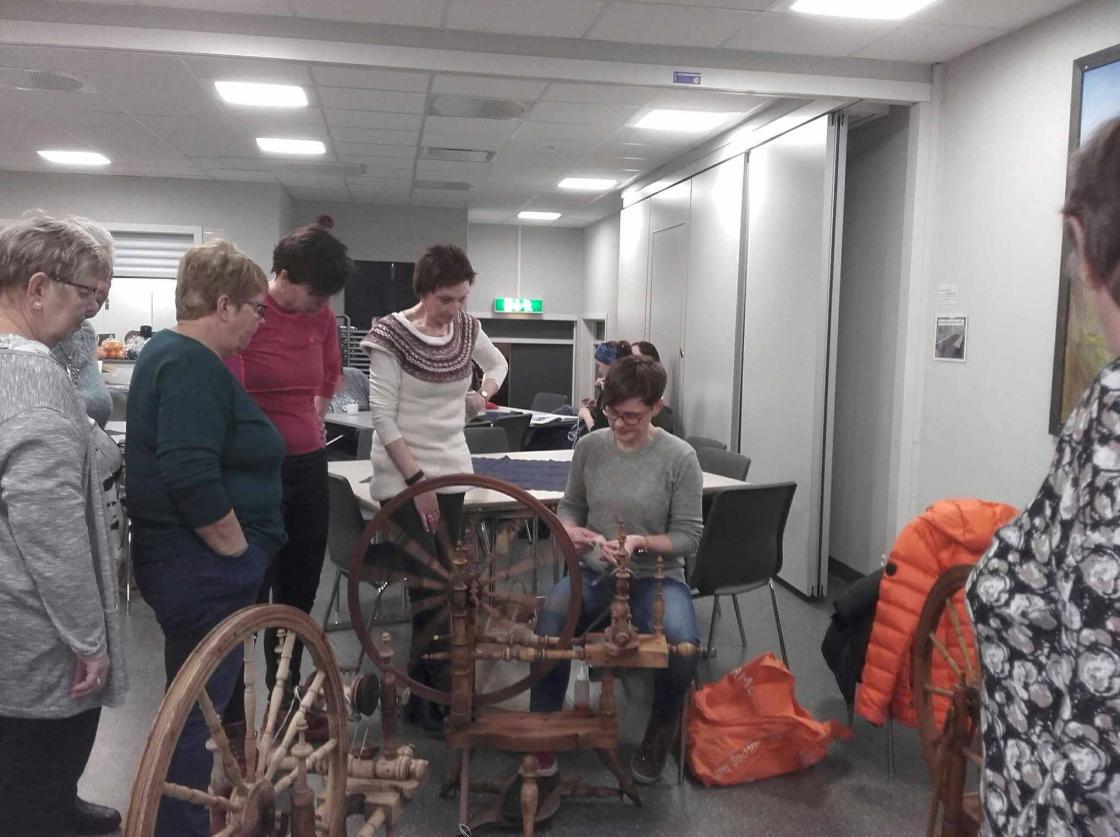 Praten gjekk livleg rundt borda mens strikkepinnar og rokkar durte i vei. Det vart nokre kjekke timar med kaffi,te og vafler og jamvel eit lite lotteri med fine gevinstar.