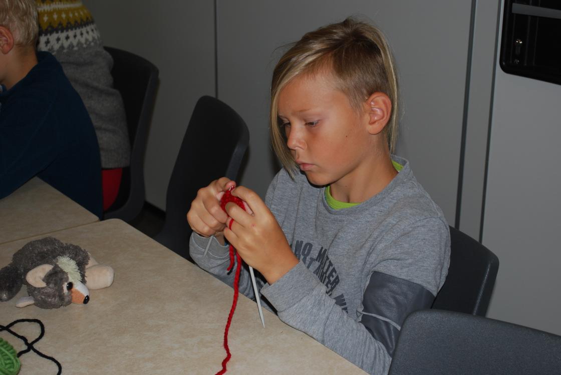 Ein elev kunne strikka, nokon av dei andre hadde prøvd før. Det blei litt plunder undervegs, men alle kom i mål med kvar sin sommarfugl.