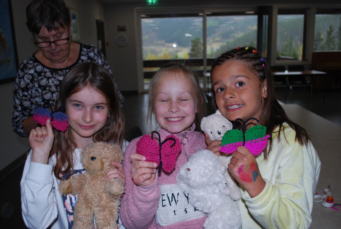 10.10.19 var det tid for strikking med 4.klasse. Me var 3 medlemmer frå laget som møtte 6 spente elevar. Då dei hadde valgt seg garn, var det å leggja opp masker til sommarfuglar.