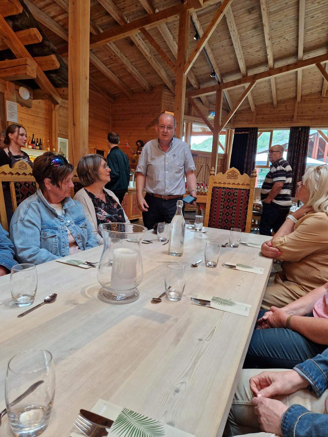 I Hardangerviddahallen restaurant ble vi ønsket velkommen av direktør Oddvar Brakestad. Vi fikk servert nydelig middag - hjortegryte for de som ønsket det og fjellaure til resten. Til dessert fikk vi servert karamellpudding.