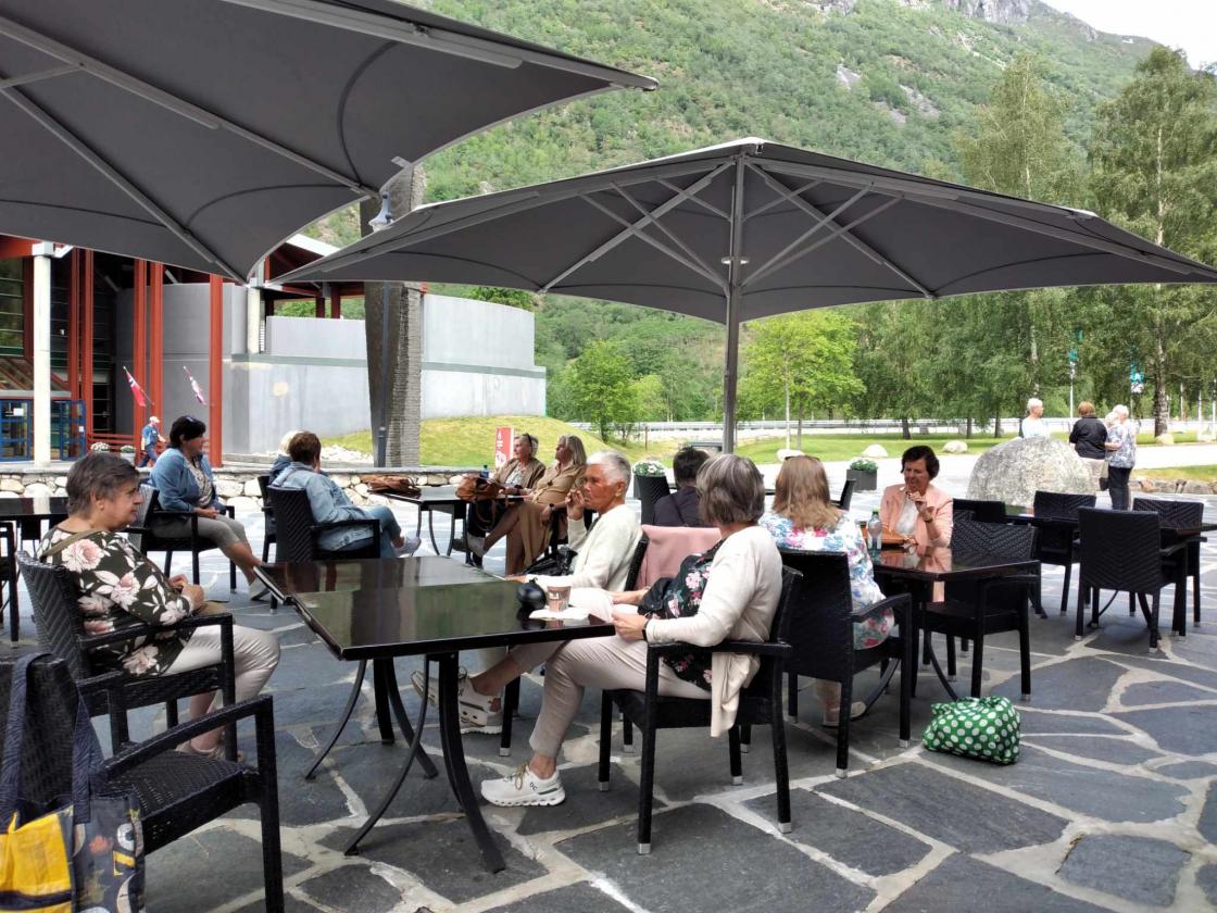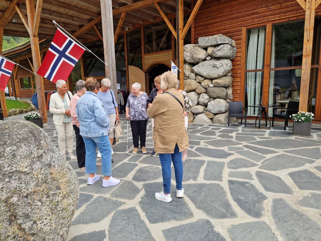 Det ble en kort stopp i Kinsarvik for å strekke på beina og litt handling. Vi kom til Øvre Eidfjord i god tid før middag. Vi fikk sett filmen Norge mitt land - Fjord, Fjell, Foss og Hardangervidda. Fantastisk panoramafilm.