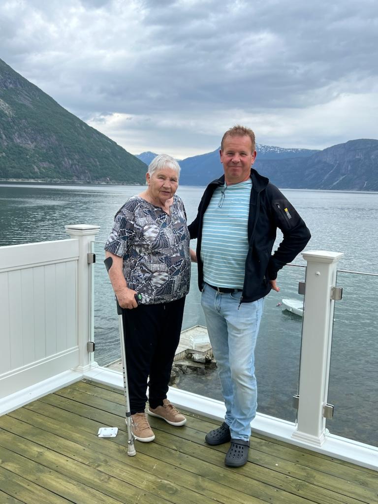 Margot og nevøen, som no har huset der Margot vaks opp. Kjekt for Margot og besøka plassen. Bilde tatt av Gunvor S.