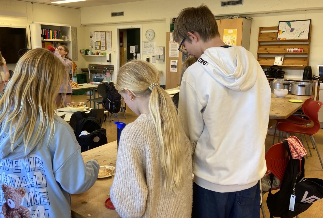 De startet med å skrive ned oppskriften. Deretter skulle grøten lages, de målte opp og røring av grøten gikk på omgang. Elevene fikk hver sin skål med Vetlagraut med seg heim.