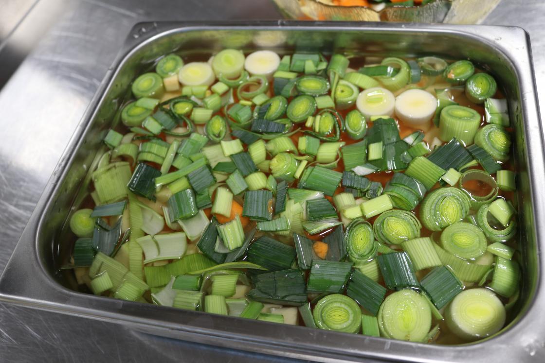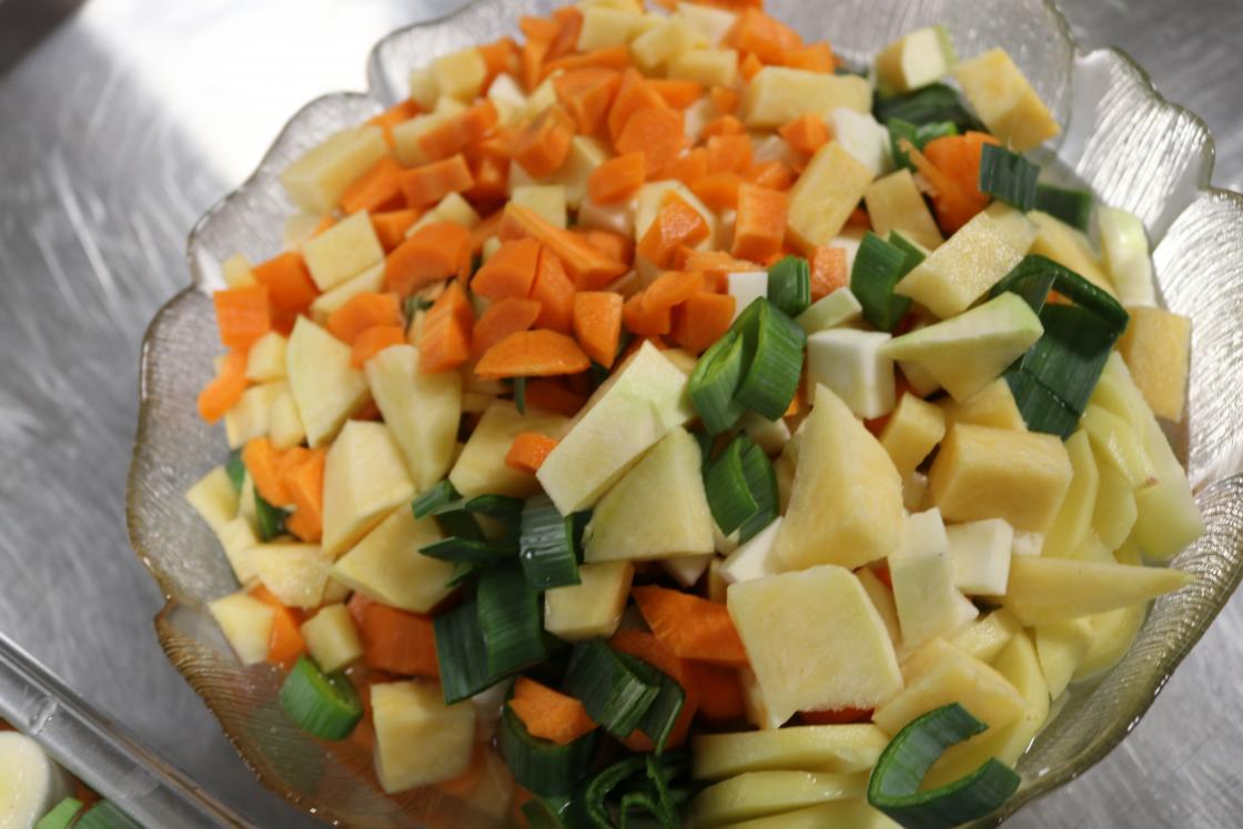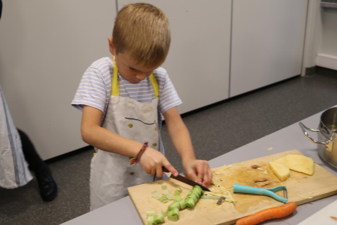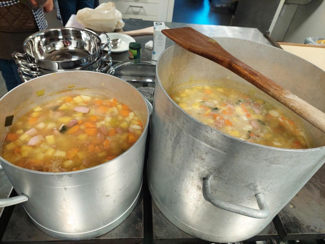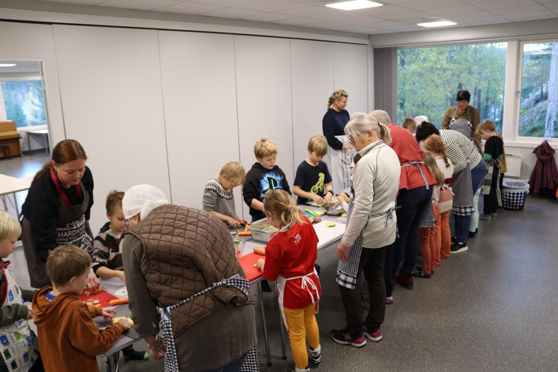 Elevane var skikkelig ivrige med skrelling og oppskjæring av poteter, gulrøtter, purreløk, selleri og pølser. Bygggryn og røykekjøtt blei og brukt i suppa.Etter at suppa var kommet på kok, var dei ute for å finne høstpynt til bordene.