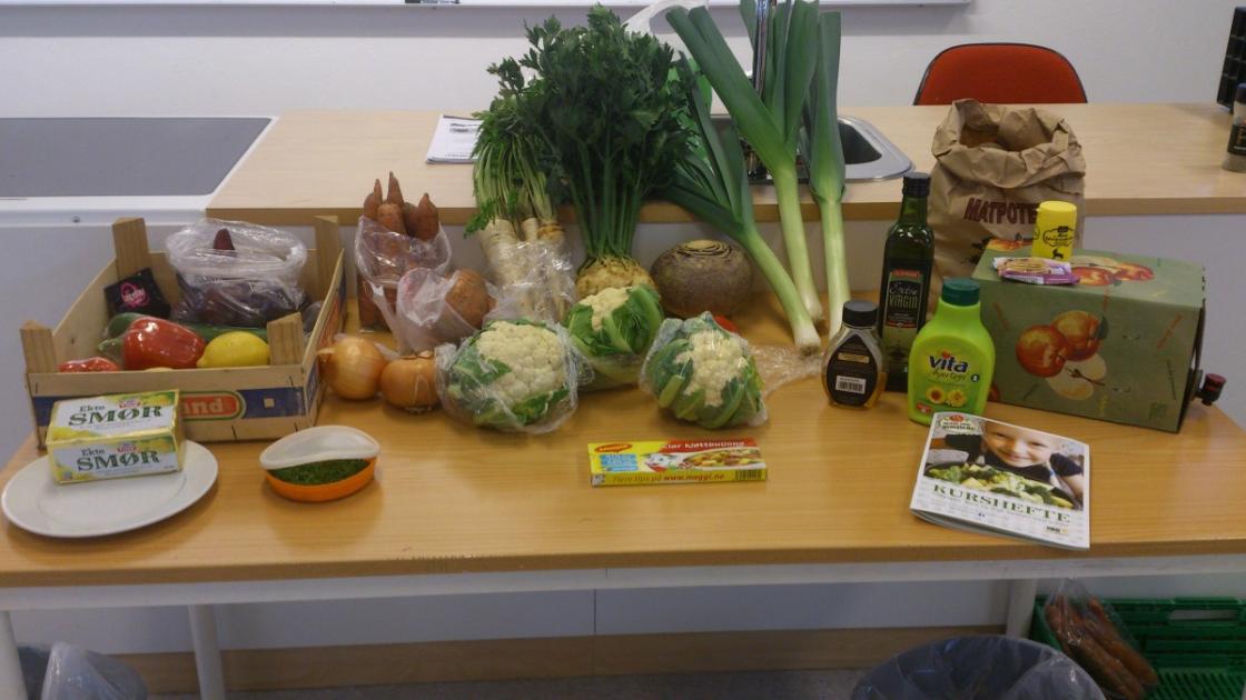 Det første kurset ble holdt på skolekjøkkenet på Hornnes skole. Her møttes 7 barn og 5 voksne klare til å lage mat sammen. Vi ble kurset av Anne Berit Mathisen. Det ble skrellet og kuttet. Vi lagde blomkålsuppe til forett, ovnsbakte grønnsaker og laksekarbonader til hovedrett. Vi stekte også sveler til dessert.