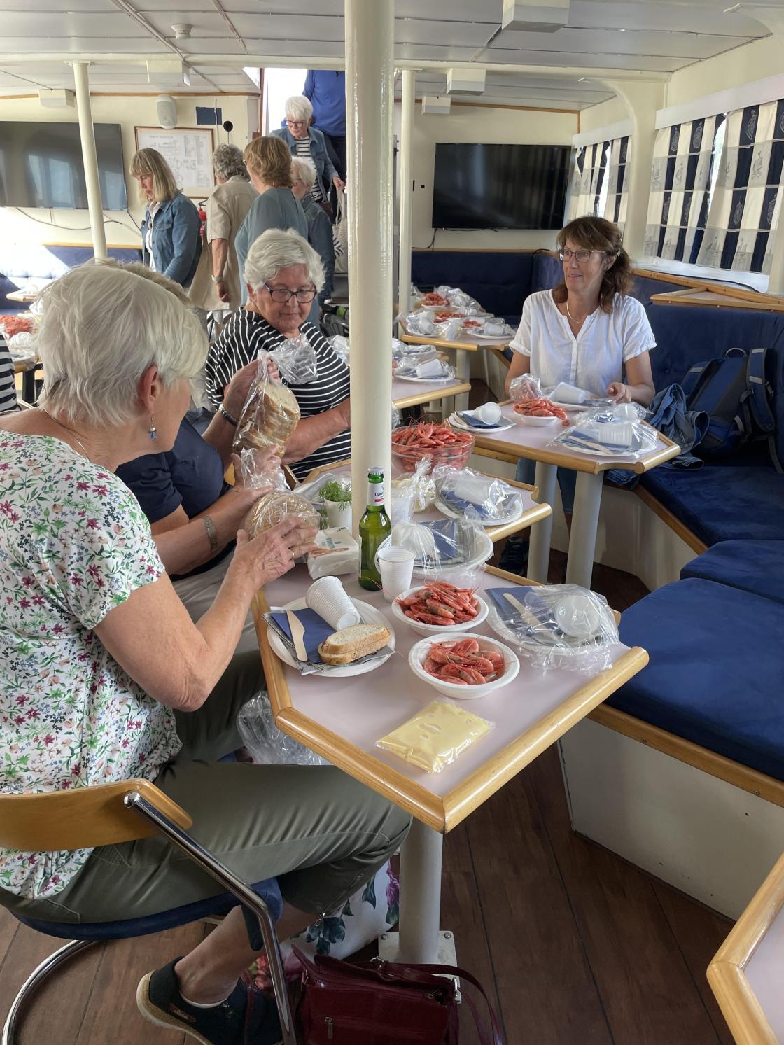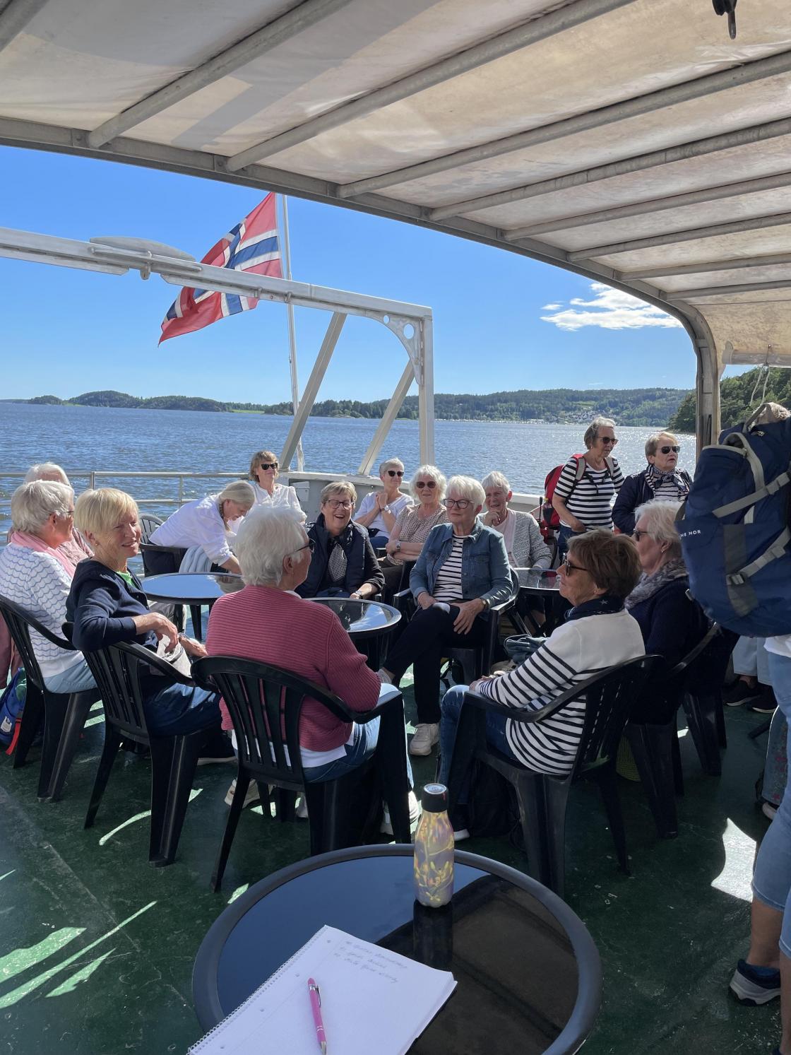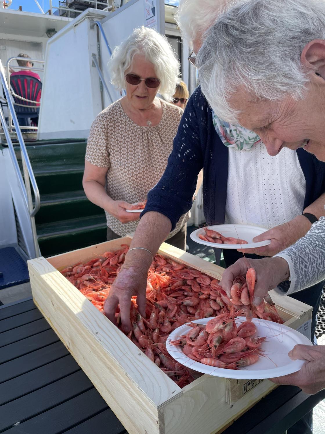 50 bygdekvinner på tur til Singløya , vi har kost oss med ferske Hvaler reker, sang og skravling ombord