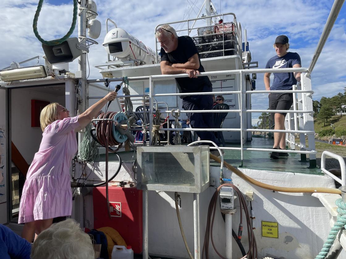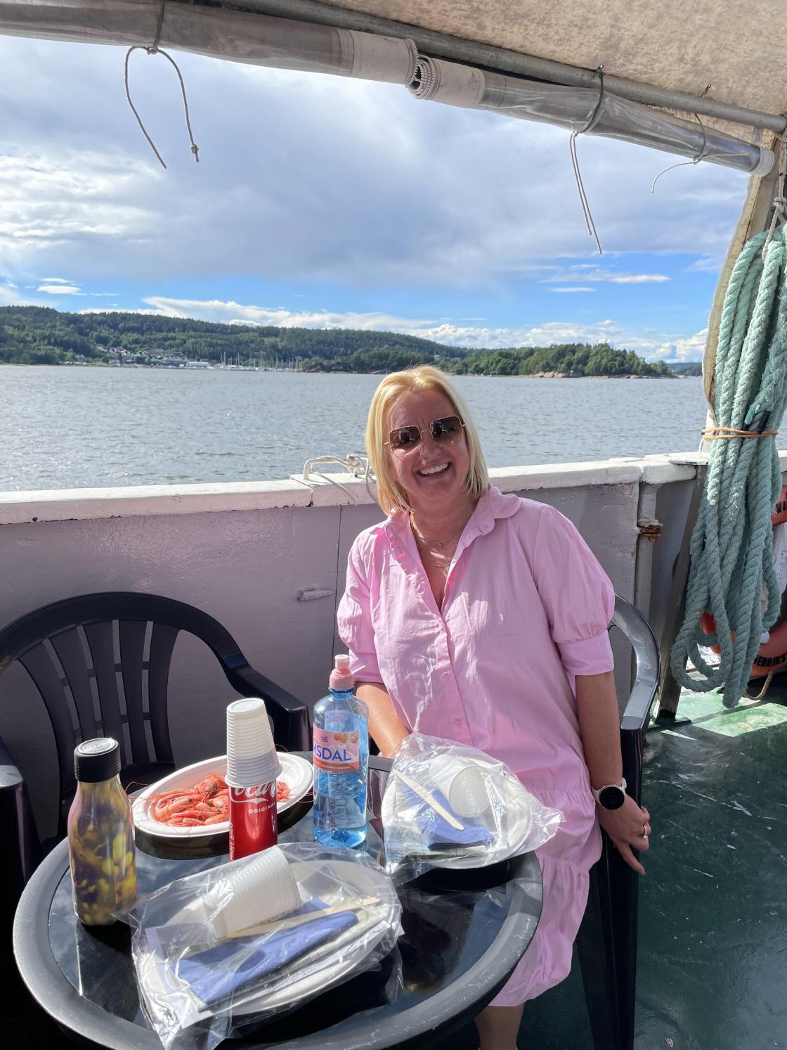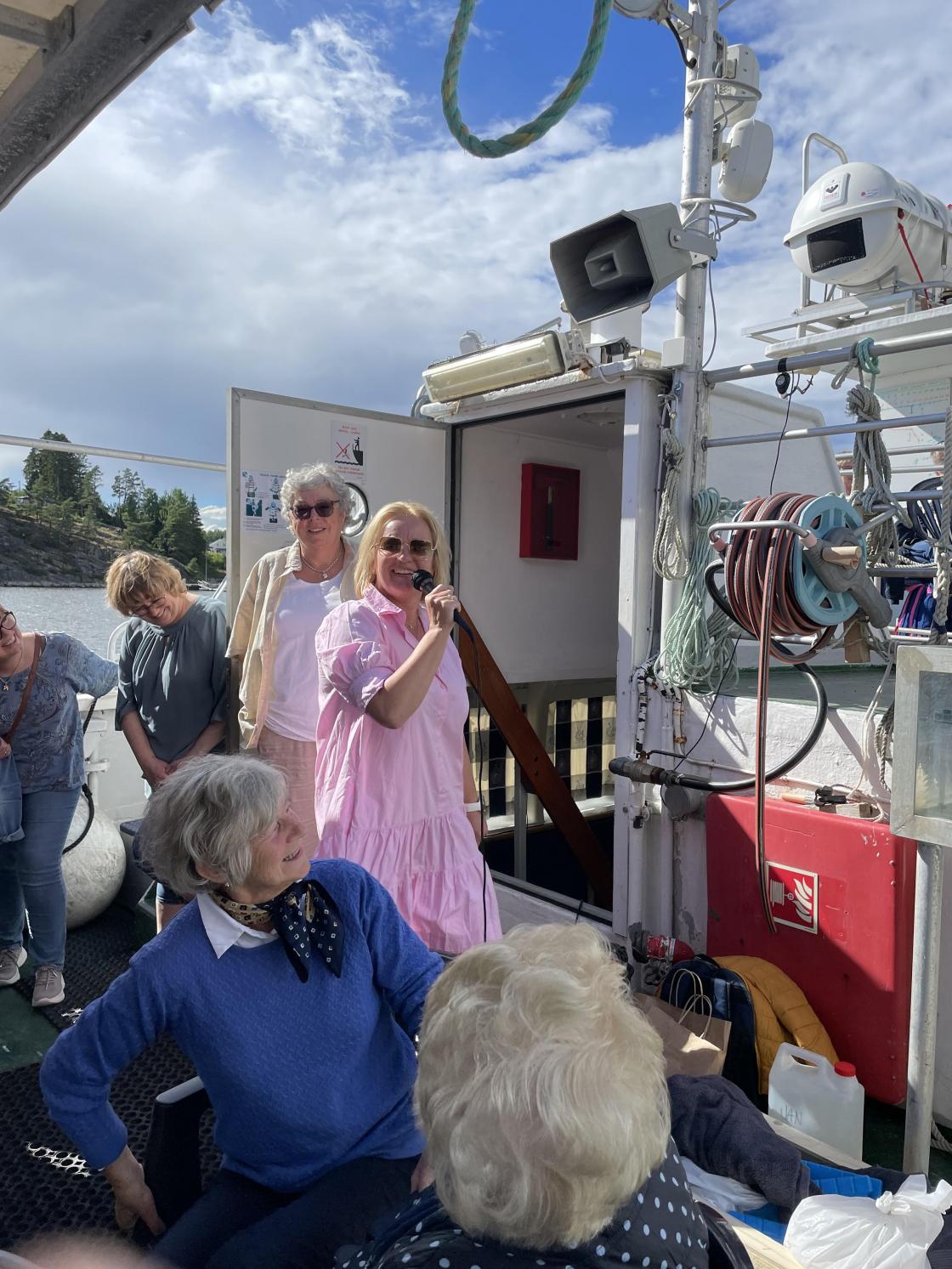 50 bygdekvinner på tur til Singløya , vi har kost oss med ferske Hvaler reker, sang og skravling ombord