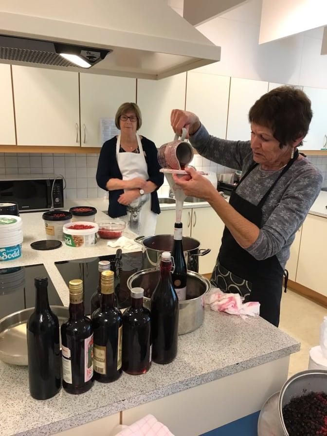 Deretter dro vi tilbake til skolen, der to av damene var i gang med å bake blåbærmuffins, som vi skulle overraske med, så de fikk se hva blandt annet bær fra skogen kunne brukes til. De hadde også gjort klart en stor kjele med vann på kok. Så da var det bare å få bæra oppi saftkokeren, og slå over kokende vann, så var prosessen i gang. Den må stå flere timer å dampe, så elvene gikk igang med skolearbeidet, mens bygdekvinnene passet saftkokeren. Elevene kom innom flere ganger i løpet av dagen for å se. Vi hadde med saft som var ferdigkokt tidligere, siden prosessen med saftkokinga endel tid. Elevene fikk servert blåbærmuffin og vafler med rørte villbringebær og blåbær i tilleg til saft. Til dessert fikk de rips med vaniljesaus. På slutten av dagen var de innom kjøkkenet for å se at det ble tappet ferdig, varm saft på varme flasker. Det ble hele 8 liter saft og alle var enige om at det hadde vært en fin dag.
