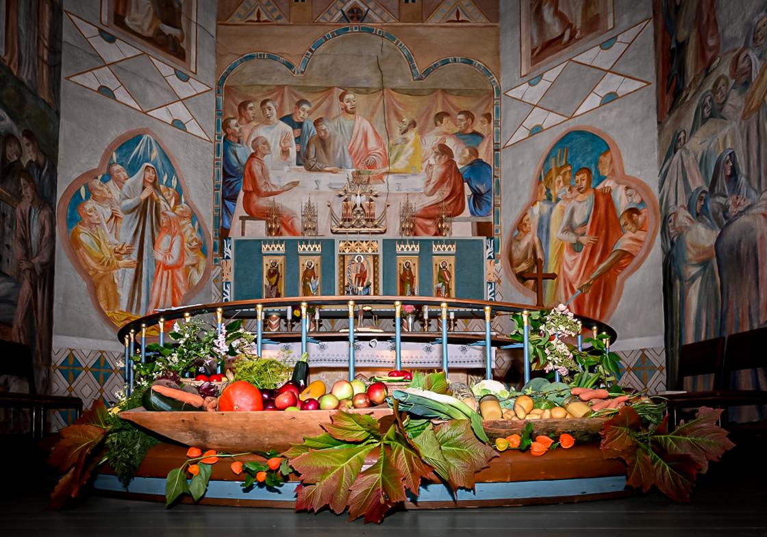 Markens grøde pynter opp alter-ringen i Slagen Kirke