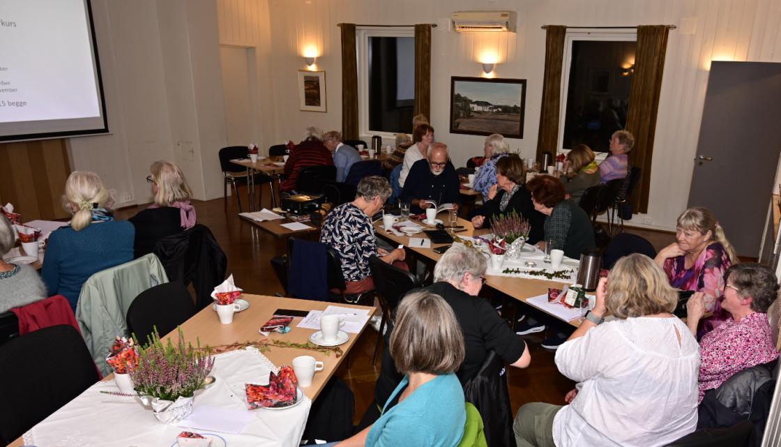 Rundt 30 damer var litt spente på kveldens tema, trafikkregler. Trafikkbilde har jo forandret seg mye på alle de årene etter at mange av oss tok kjøre-kort. Olav var smart og brukte google-map, der vi kunne se lokale veier og kjøremønster, med kryss, rundkjøringer og landeveier. Spørsmål om vegtrafikklovens forskjellige paragrafer, så er en av de viktigste § 3 som er en grunnbestemmelse for trafikkreglene. Vi har alle hørt at man skal ferdes HENSYNSFULT, AKTPÅGIVENDE og VARSOM i trafikken. Men hva betyr egentlig dette? Noe vi ble spurt om i forsamlingen. Hva betyr ordet AKTPÅGIVENDE? Summen i salen.... Så sier en av damene, OPPMERKSOM, ja og har vi disse tre ordene i hode oppfatter man trafikkbildet godt.