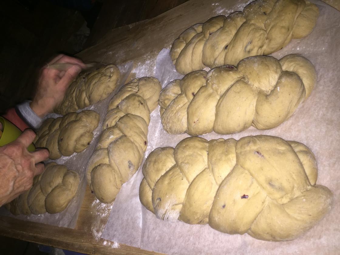 Sett ovnen på 200 grader. Del deigen i 3 emner som formes til brød. Flett gjerne deigen for å få et enda finere mønster. Legg brødene over på et papirkledd bakebrett. Hev videre under et klede i 30 minutter. Snitt brødene og stek dem nederst i ovnen i ca 40 min, eller til de er ferdige. Avkjøl på rist.