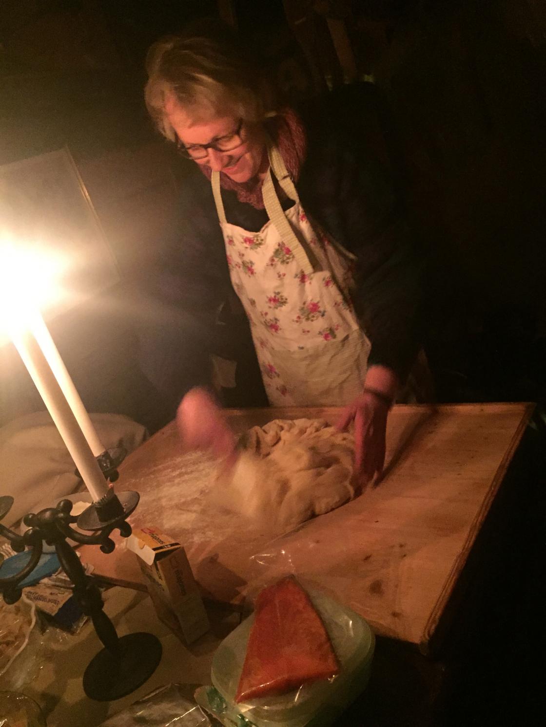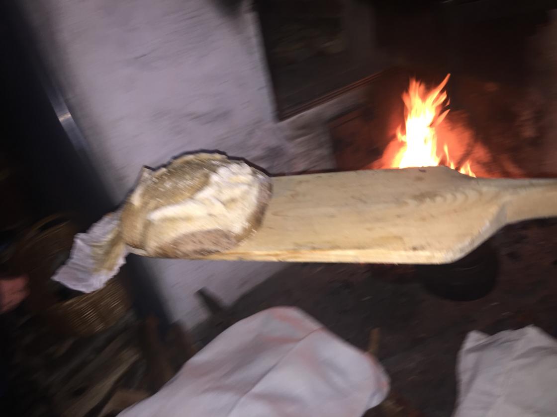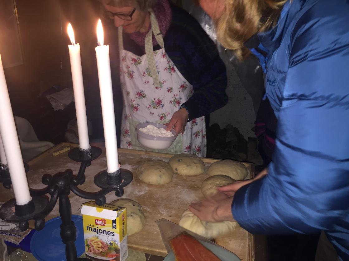 Inne i størhuset hadde Inger Karin varmet opp bakerovnen. Alle fikk prøve seg på å bake vørterbrød, julebrød og brød for så å steke dem i bakerovnen.