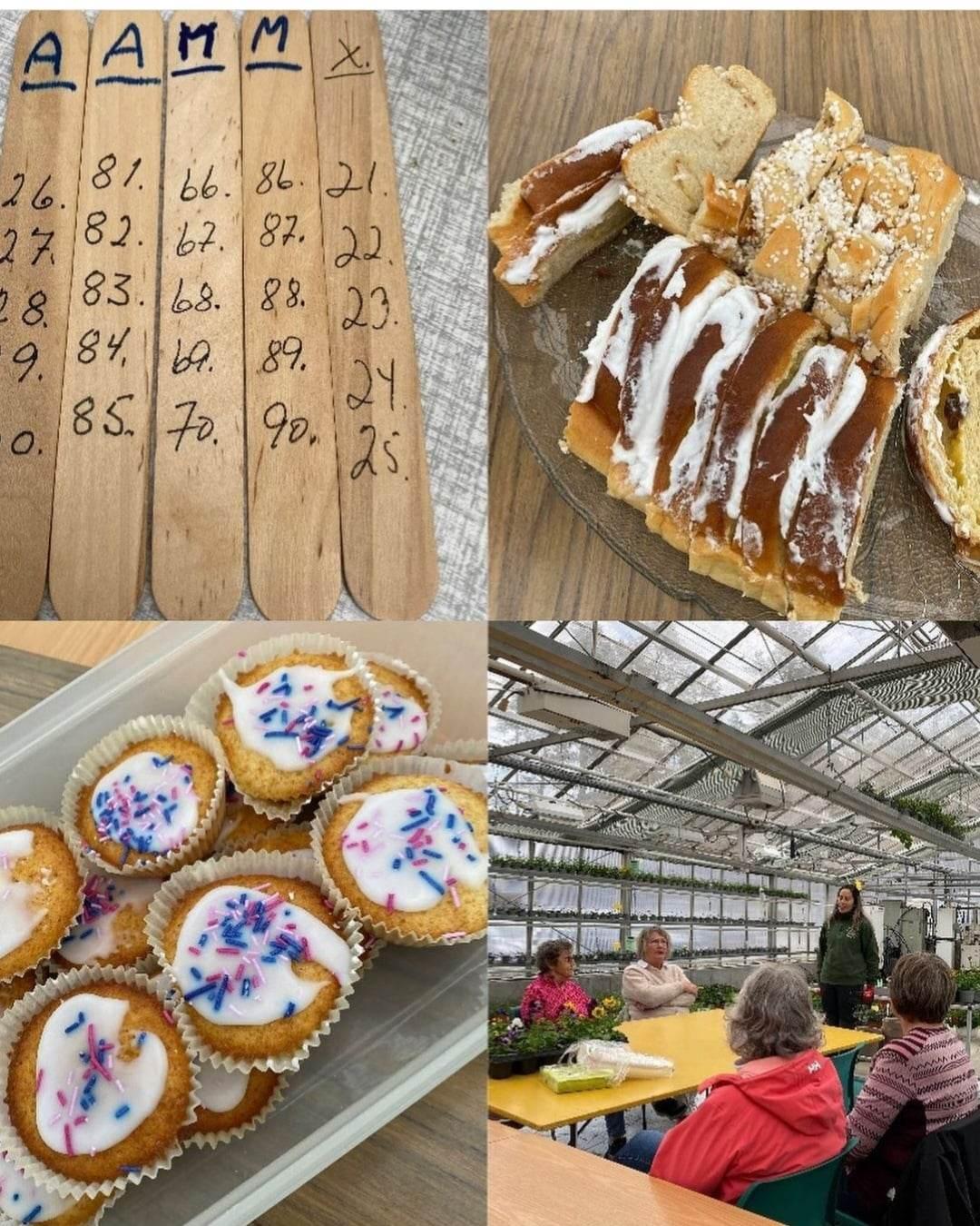 Da blomsterhandlingen var over, ble det kake og åresalg som alltid. Kveldens gevinster var stemorsblomser.