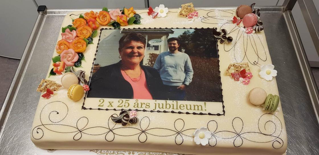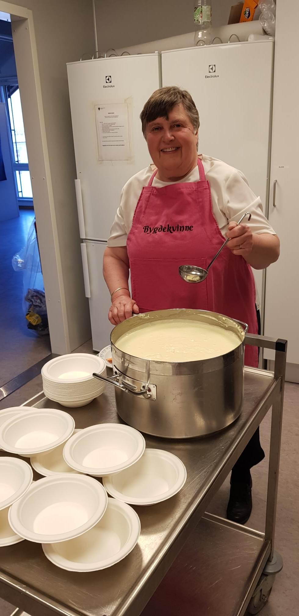 Vi serverte rømmegrøt og spekemat til alle de ca 80 frivillige, som hadde møtt opp for og feira 25 jubileum til Spydeberg Frivilligsentral Vi takket også av Bodil Flobakk som daglig leder etter 25 år i jobben.