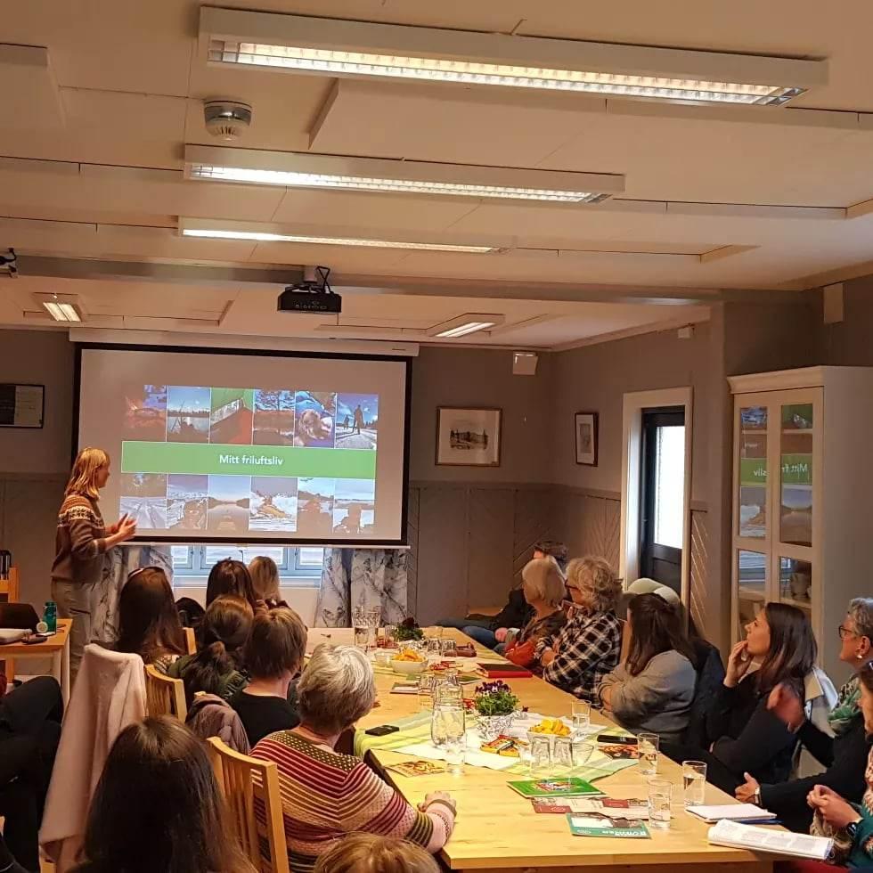 Sola skinte ute og det var fint turvær , men det skulle man ikke tru. Inne på Spydeberg Frivilligsentral var ca 45 personer samlet for å høre Tine Sødergren fortelle om turtips og turmat