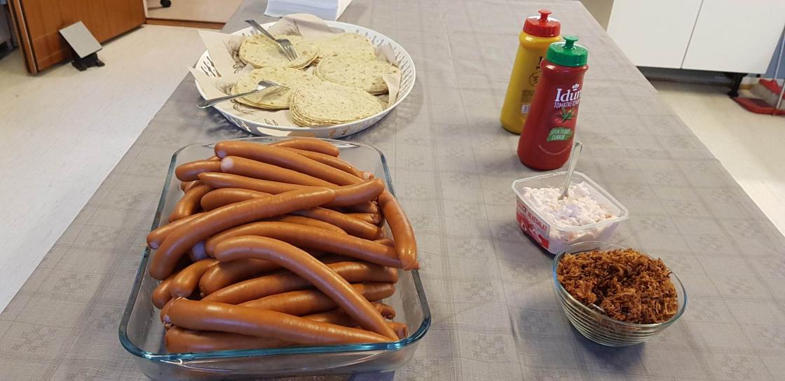.Hva passa ikke bedre enn å servere turmat nr 1 pølse og lompe og til dessert var det kvikklunsj og appelsin.![]()