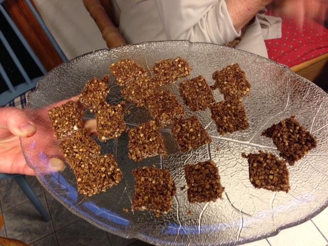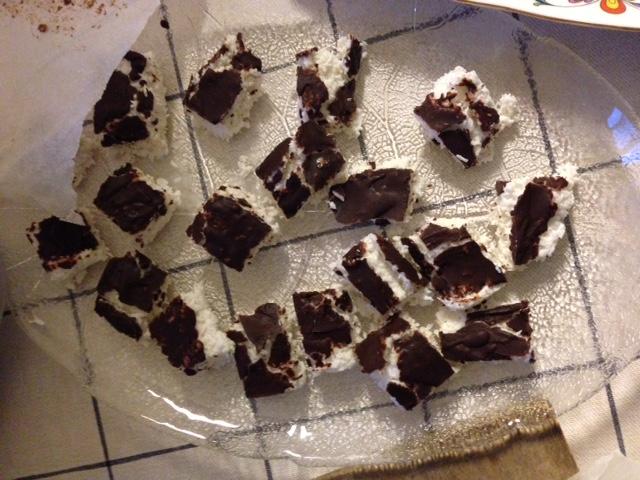 Vi lagde 5 ulike sorter godteri også tilpasset de som har matallergi og/eller diabetes. I løpet av ett par timer hadde vi lagd lakriskarameller, Bounty biter,Snickers kake, Cocosa kuler og hjemmelaget sjokolade med granateple og bokhvetespirer. Selv om du må på helsekost for å finne de fleste ingrediensene var fremgangsmåten såpass enkel at her er det bare å løpe og kjøpe og sette igang å produsere. Måtte det bli noe til overs er det bare å putte i fryseren eller i kjøleskapet for en senere anledning.