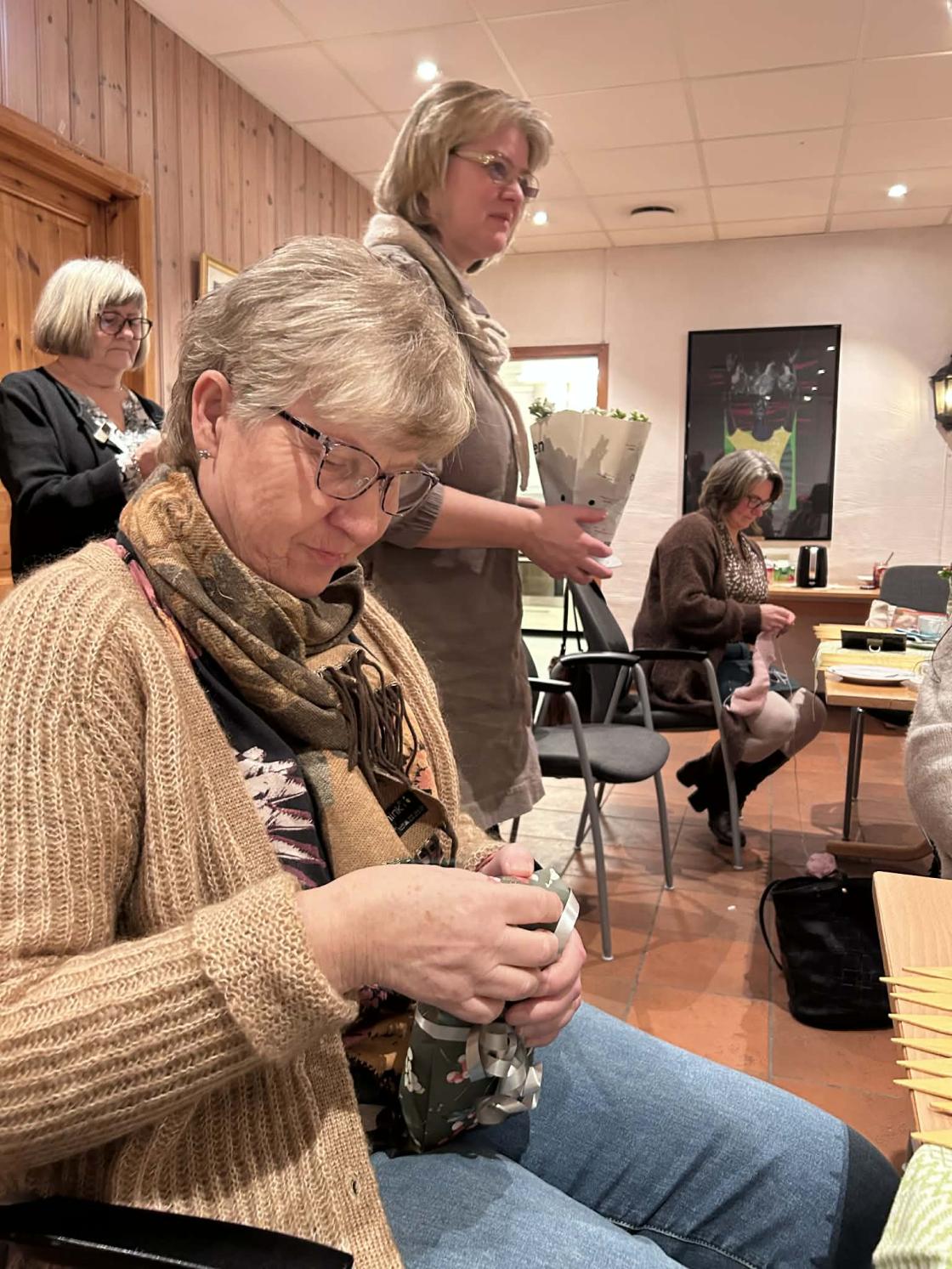 Møtet ble avsluttet med kveldsmat, kaffe og te, og et spennende åre-lotteri. Gevinstene var gitt av medlemmene, det var alt fra kaffe, blomster, håndarbeid, eplenektar osv, og pengene for salget går tilbake til laget. Det var også satt frem smaksprøver på bla fermentert mat. og det var bla rabarbarasyltetøy fra Småbrukeren til å ha på rundstykkene. (Om du er i tvil om du skal komme på neste medlemsmøte, så er disse rundstykkene alene god nok grunn til å møte opp!) Takk til vertinnene på kjøkkenet som dekket bordene, ordnet kveldsmat og tok oppvaska!