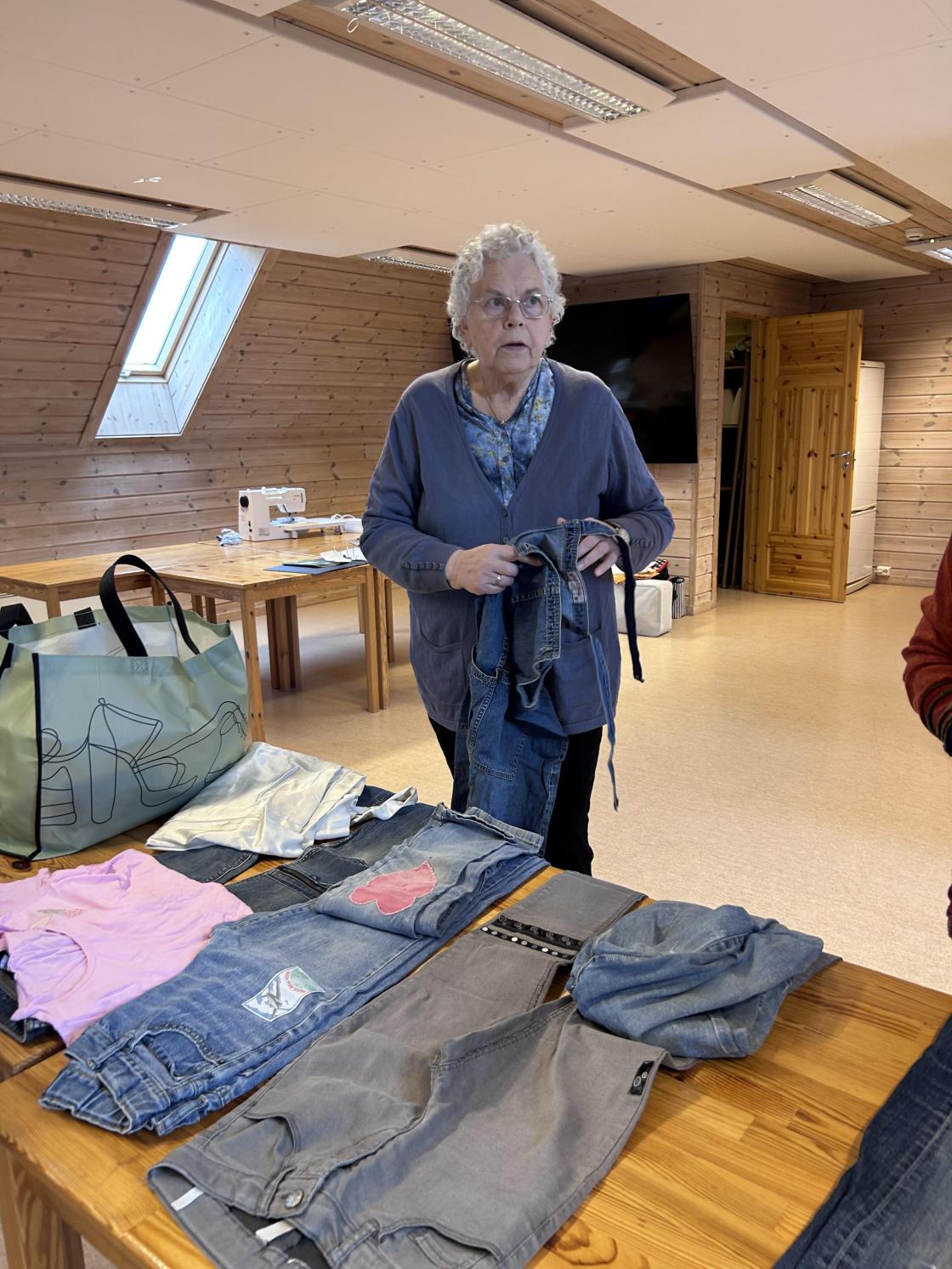 Lørdag 18.4 var sygruppa igjen samlet på Skjeestua for hyggelig samvær, for å sy og for å lære reperasjonsteknikker. Sigrun brenner for dette, og hadde med seg mange eksempler på hvordan man kan fikse et hull i en bukse eller rett og slett pimpe opp et litt kjedelig klesplagg eller til å sette et unikt preg på vesker og mapper.