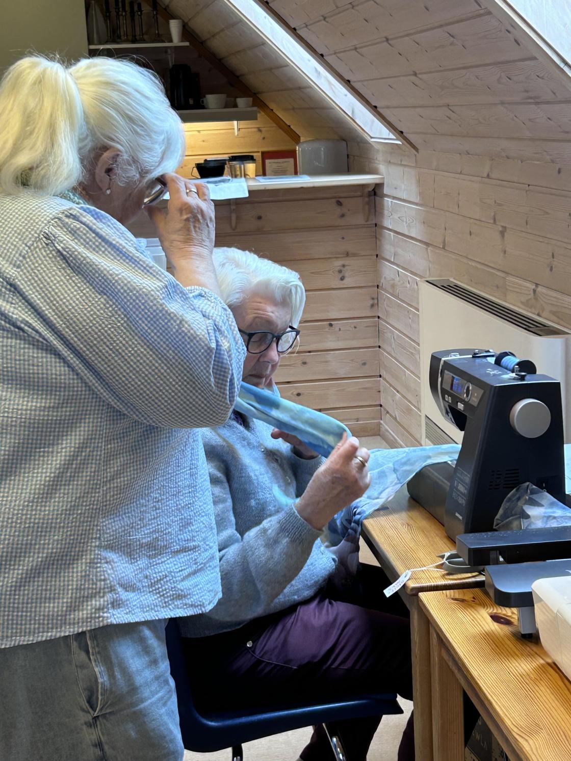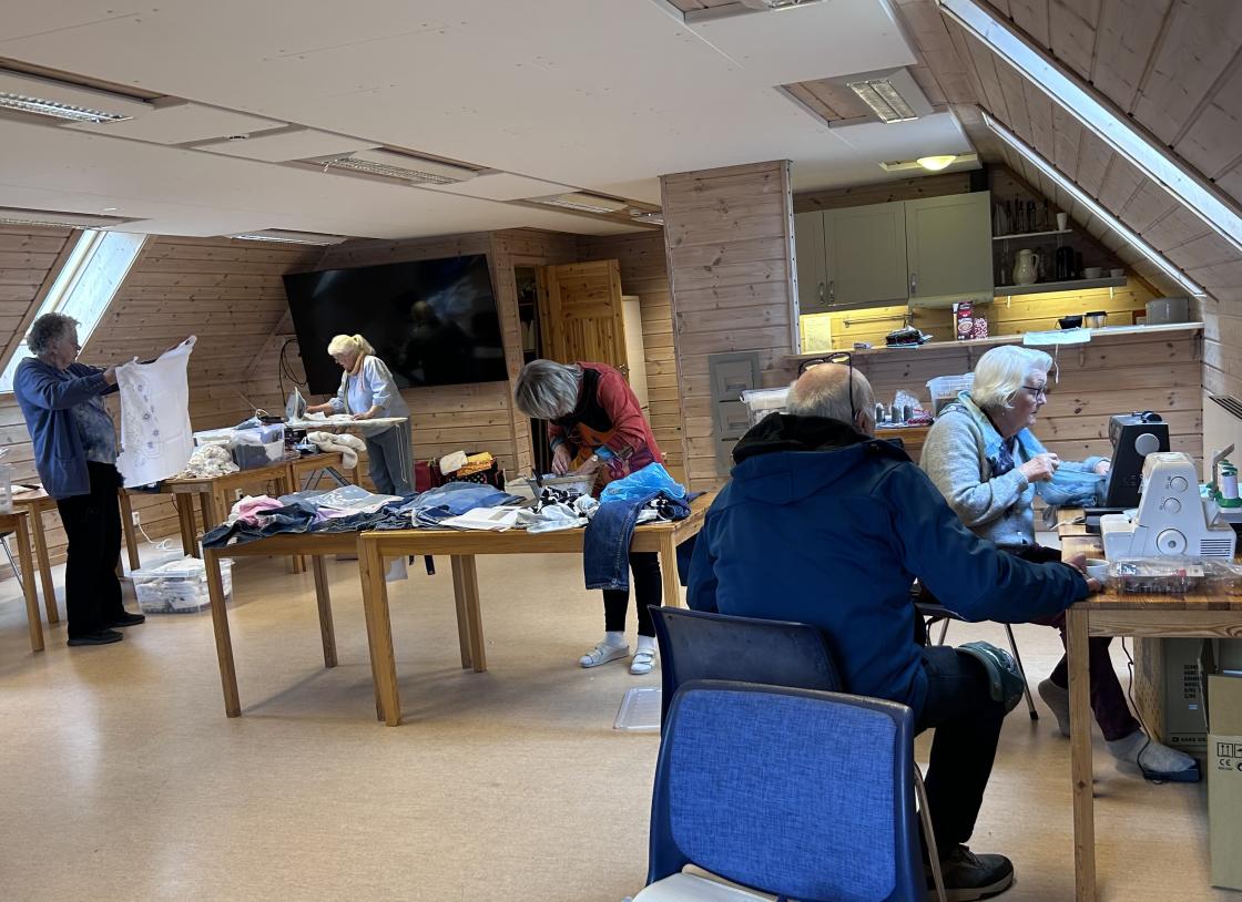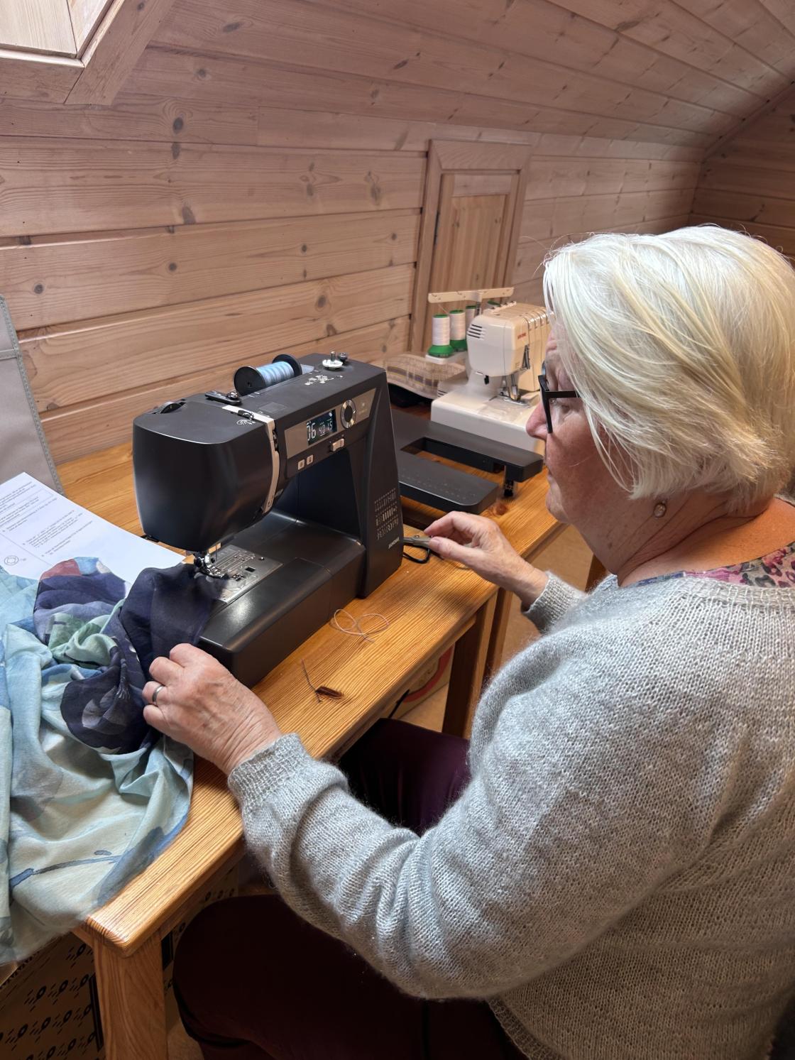 Sygruppa har endelig innviet nye symaskiner og Sigrun Kirkeberg ga en innføring i ulike reperasjonsteknikker både på maskin og med håndsøm.