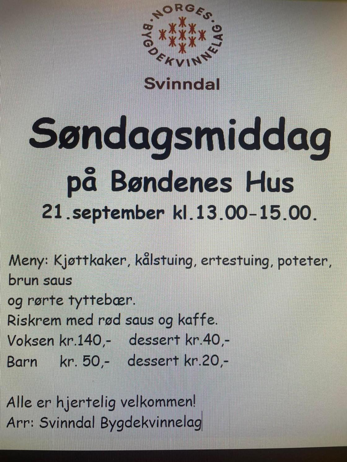 Vi starter salget av middagen kl. 13.00 og serverer til grytene er tomme, eller til kl 15.00.