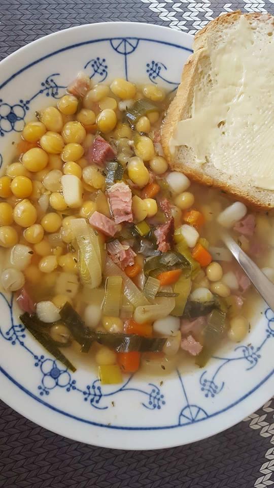 Etter ca ett par timer jobbing ute var det godt å komme inn i varmen. På kjøkkenet var det dekket klart til et deilig måltid hjemmelaga ertersuppe og brød.