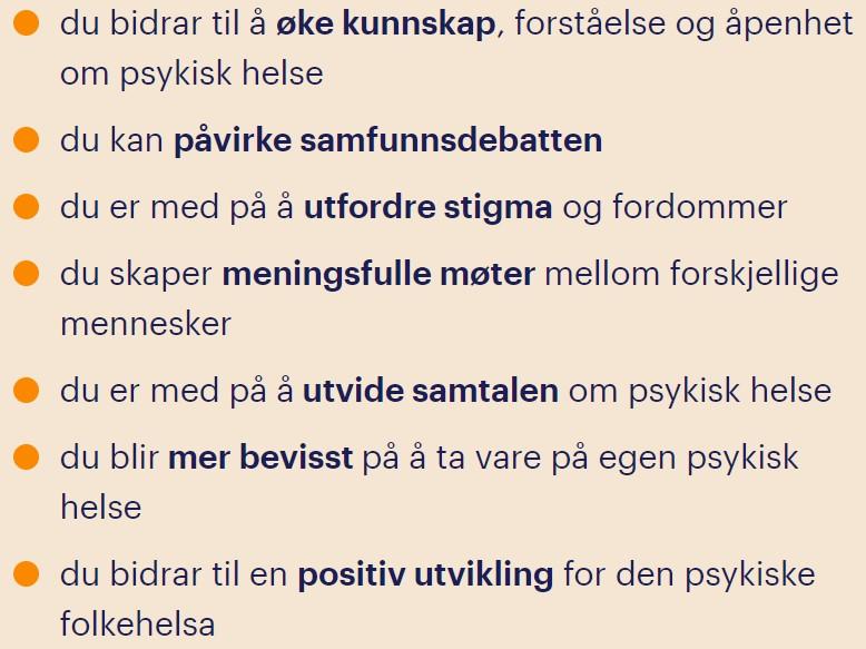 Årets kampanje oppfordrer til å gjøre de viktigste møteplassene våre mer inkluderende. Sosial støtte kan redde liv, særlig i urolige tider. Vi har alle et ansvar for å løfte blikket og lage plass til flere. (kopiert fra kampagnesiden til Verdensdagen for psykisk helse)
