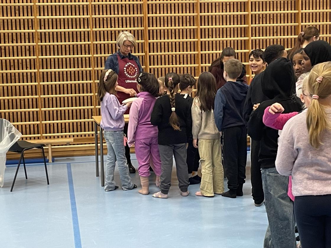 Fra klokka 08.00 var det mat og hygge i skjønn forening. Havregrøt, vann og frukt ble servert, og mange elever fant plassene sine i små klynger på gulvet i gymsalen. Praten gikk lavmælt, skuldrene var lave, og overgangen til skoledagen ble mykere enn vanlig.