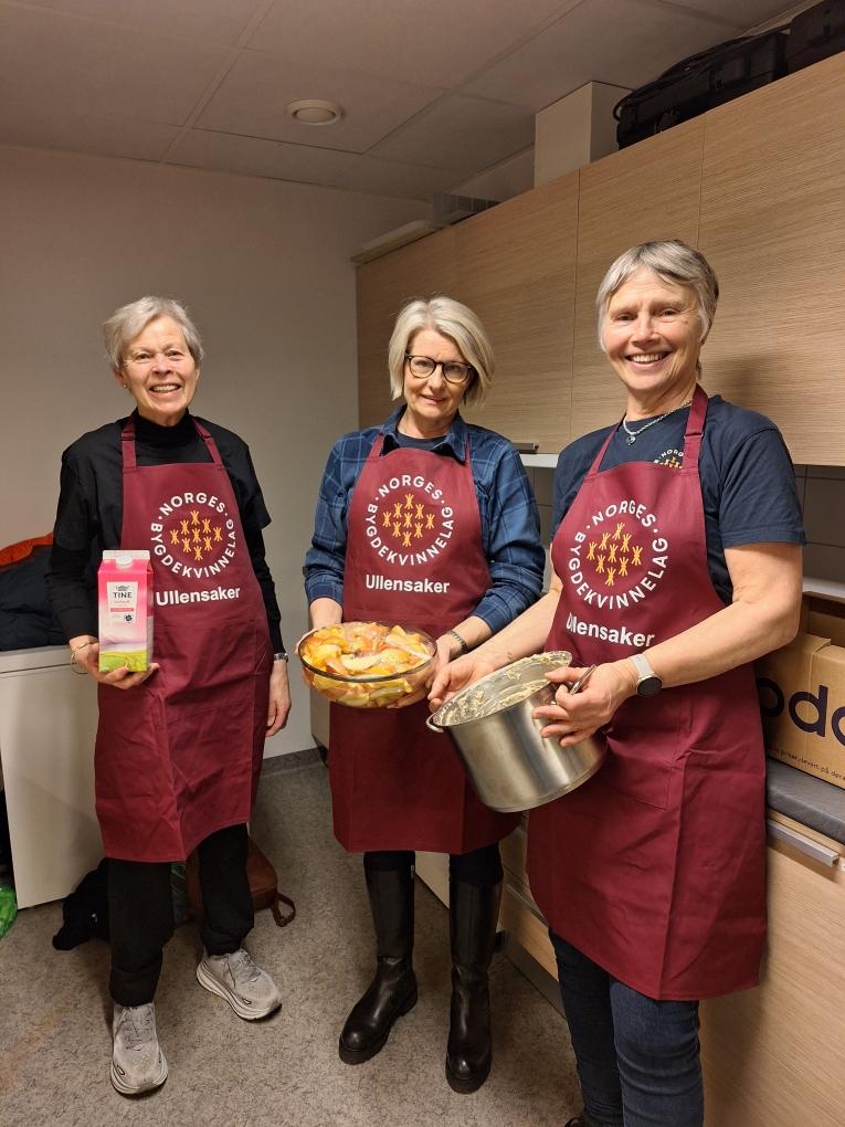 Inne i kjøkkenkroken var Ullensaker Bygdekvinnelagallerede i full sving. Grytene putret, og lukta av varm havre spredte seg i lokalet.