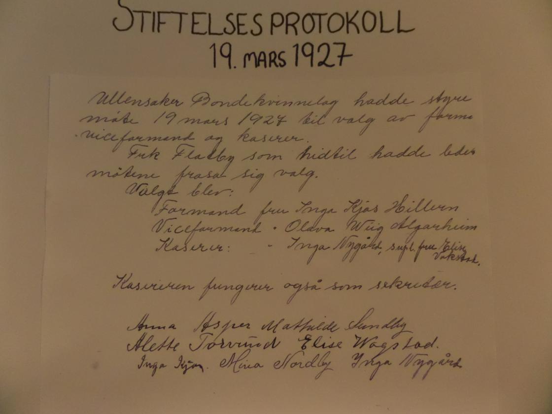 Ullensaker Bygdekvinnelag (Bondekvinnelag) ble stiftet 2. mars 1927. Det startet med 47 medlemmer. Hver skolekrets var representert i det første styret.