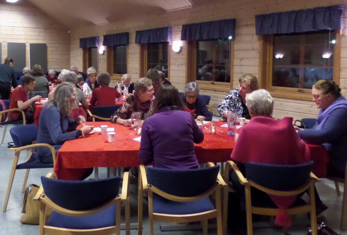 30 damer hadde møtt fram til denne hyggelige kvelden på Menighetsstua ved Furuset kirke. De ble ønsket velkommen med gløgg i julepyntet «stue».