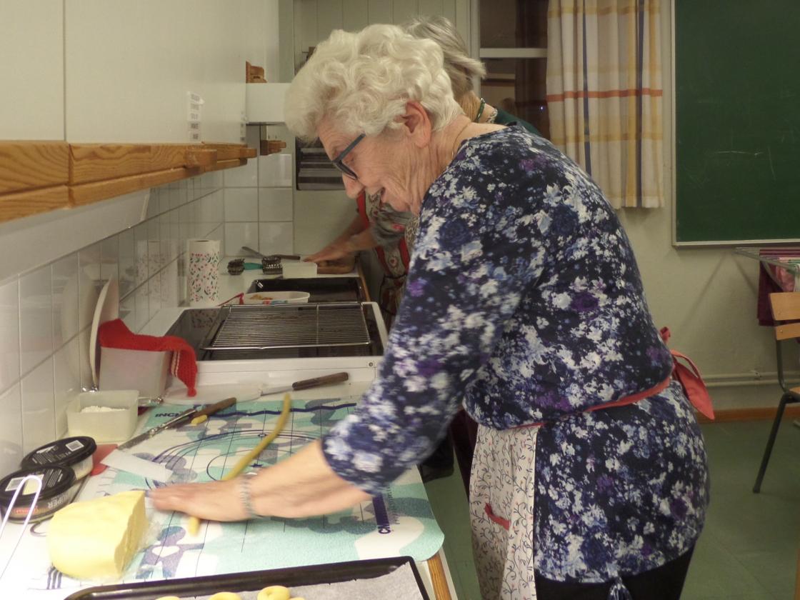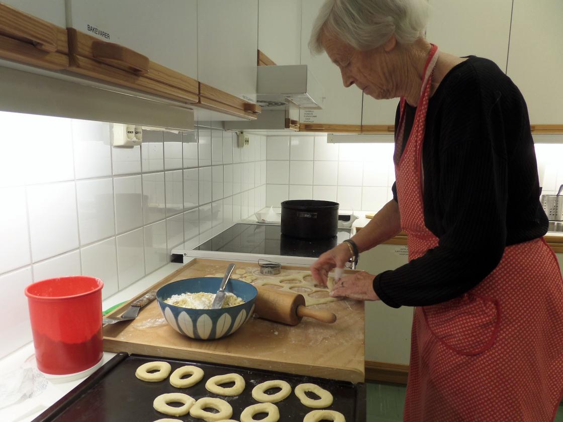 Oddveig stekte smultringer- i smult. Deigen var laget på forhånd. I den var det mye godt, blant annet egg, seterrømme, konjakk og meierismør. Inger sto for berlinerkranser, Kirsten bakte sandkaker. Formene hun brukte var 100 år, tror jeg hun sa. Lisbeth stekte krumkaker. Helene stekte både serinakaker og havreflarn. Hanne stekte brune pinner, populære kaker.