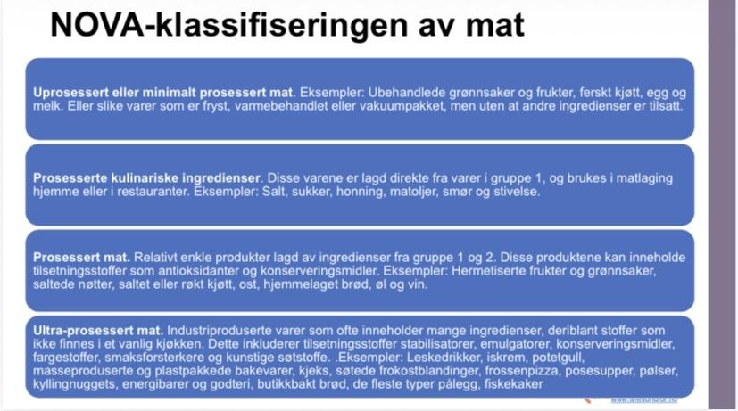 At det kan være vanskelig å velge mat som er sunn for helsa er en kjensgjerning. Noe klokere ble vi samtidig som det kan oppleves forvirrende å holde styr på hva som er Prosessert eller minimalt prosessert mat, Prosesserte kulinariske ingredienser, Prosessert mat eller Ultra-prosessert mat. Hvis du synes dette er voldsomt og komplisert er du nok ikke den eneste. Bildene vedlagt blir som en kort oppsummering av deler av budskapet.