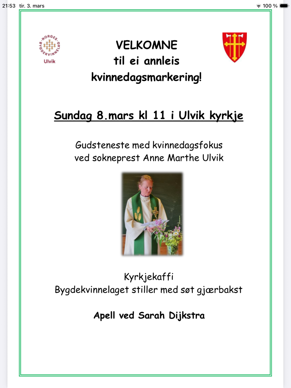 Forside Årsmelding Årsplan Dåpskjole Jonsokbryllaup Vevstova Mar 08 Sun Ulvik Bygdekvinnelag Gudsteneste med kvinnedagsfokus og apell ved Sarah Dijkstra Ulvik Kyrkje søn 08.03.2026 11:00 Del på: