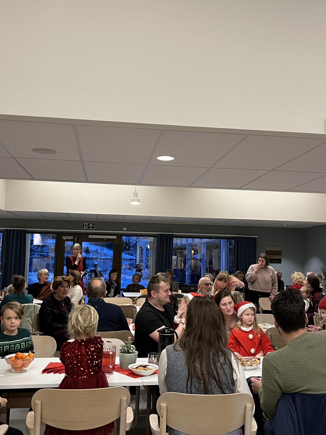 Åsa Gunnarsdottir, leia festen og me byrja med å syngja ein jolasong. Elin Rondestveit er så snill å spela piano , i lag med jolasongane.