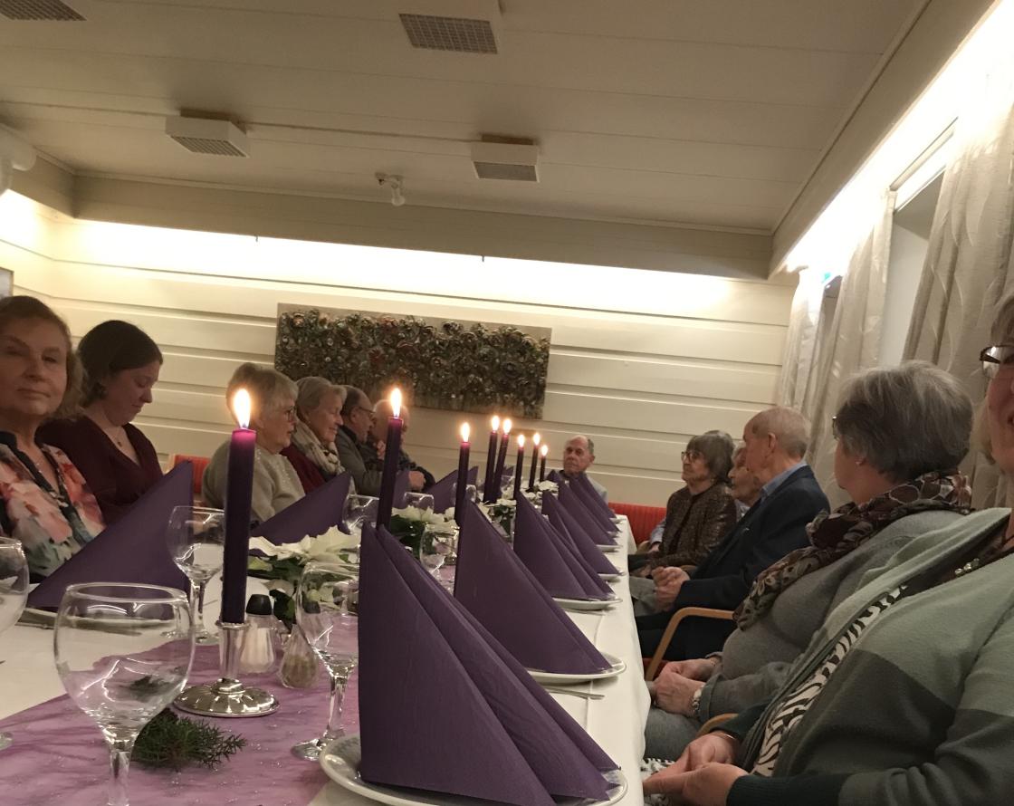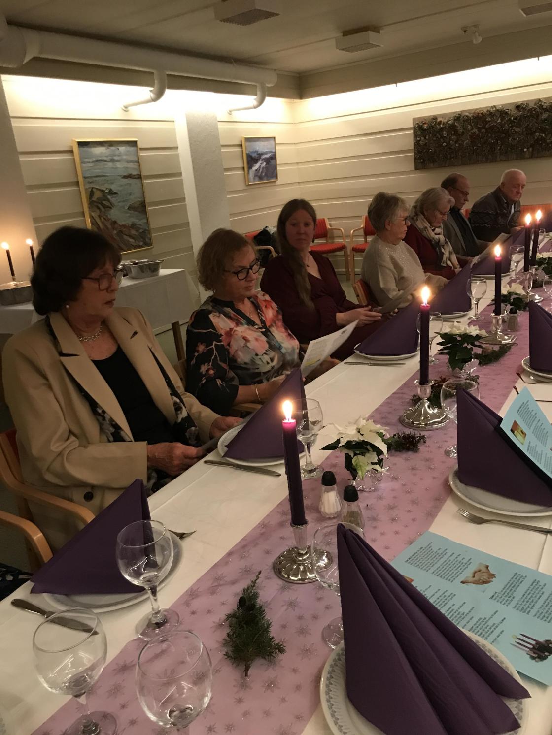 Bordet var fint pyntet til adventtiden. Lilla lys og servietter. Einerkvister med div kongler og hvite julestjerner var en fin ramme for årets siste samling i Bygdekvinnelaget.