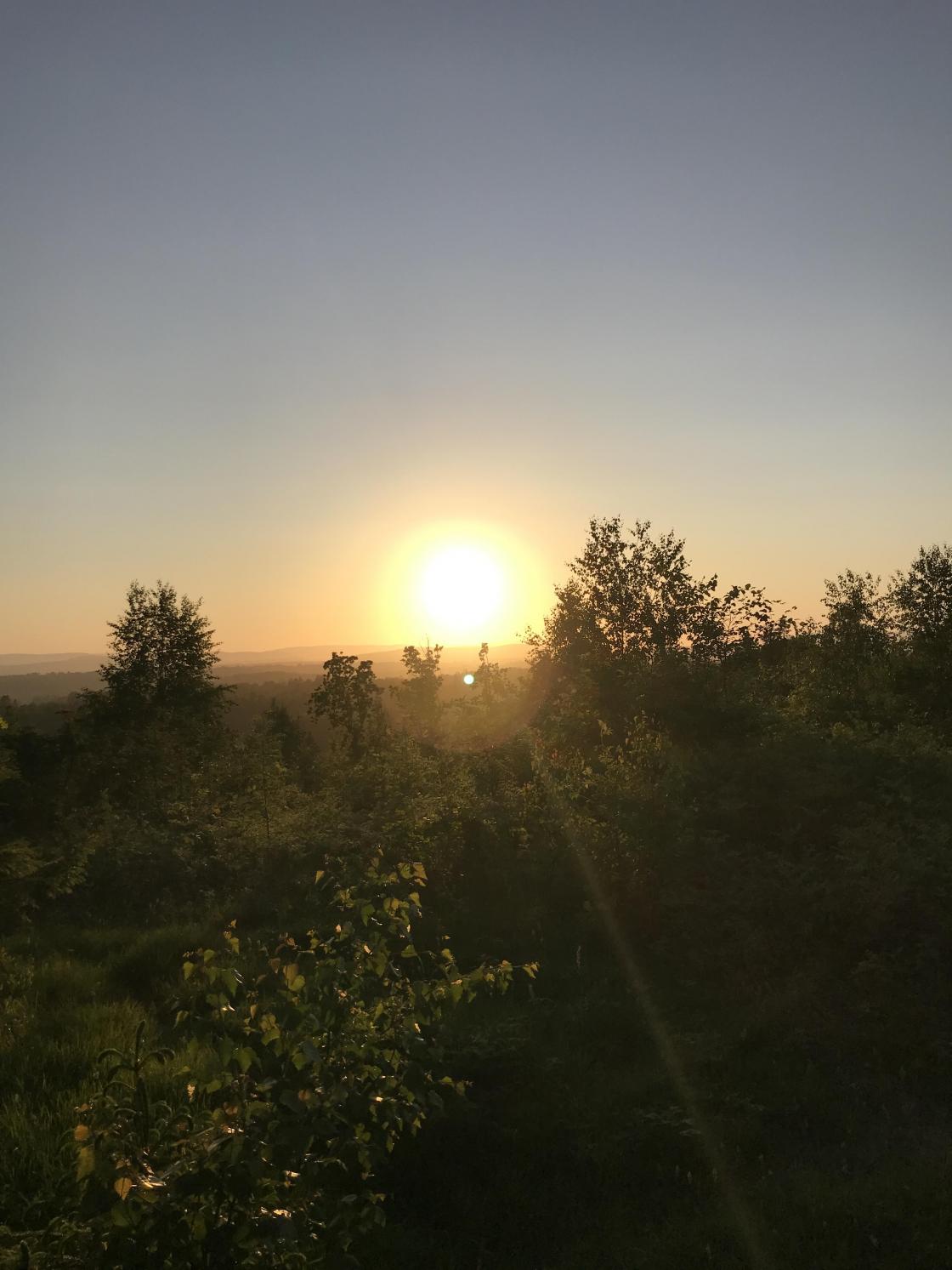 Etter deilig servering, kos og prat var det tid for å rusle gjennom skogen denne lyse kvelden med fuglekvitter og sol på vei ned i vest. Dis over fjellene lagde fin stemning, men synes ikke så godt på bildet.