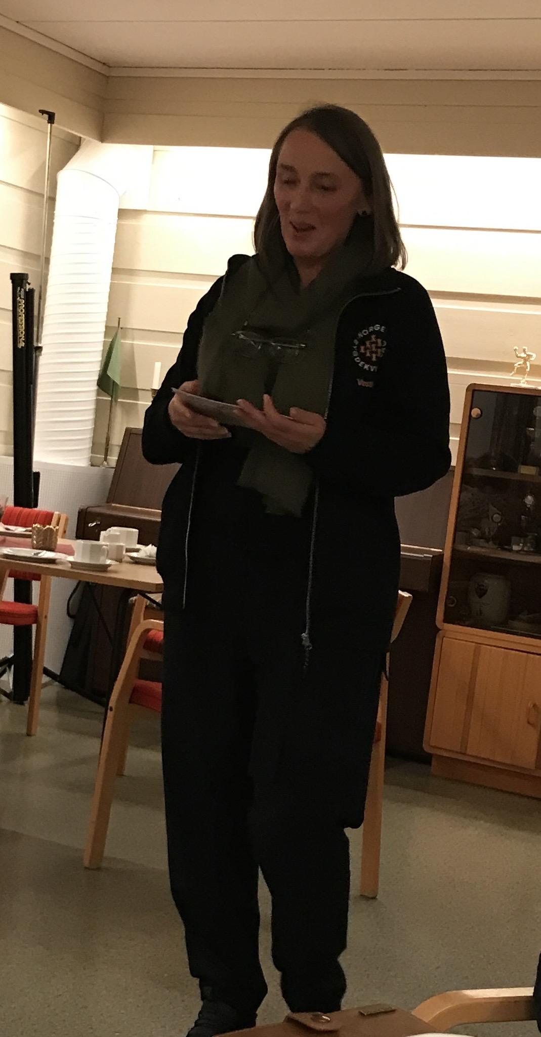Leder Jorunn Kjærnes takket alle for at de kom, for at de stiller opp med kakebaking til julegrantenning og juletrefest og vel hjem. En spesiell takk til Ingrid for hennes informasjon og hyggelige tilstedeværelse.