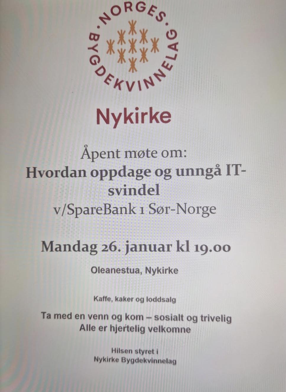 Flere av våre medlemmer besøkte i går Nykirke bygdekvinnelag med tema “Hvordan oppdage og unngå IT svindel”.