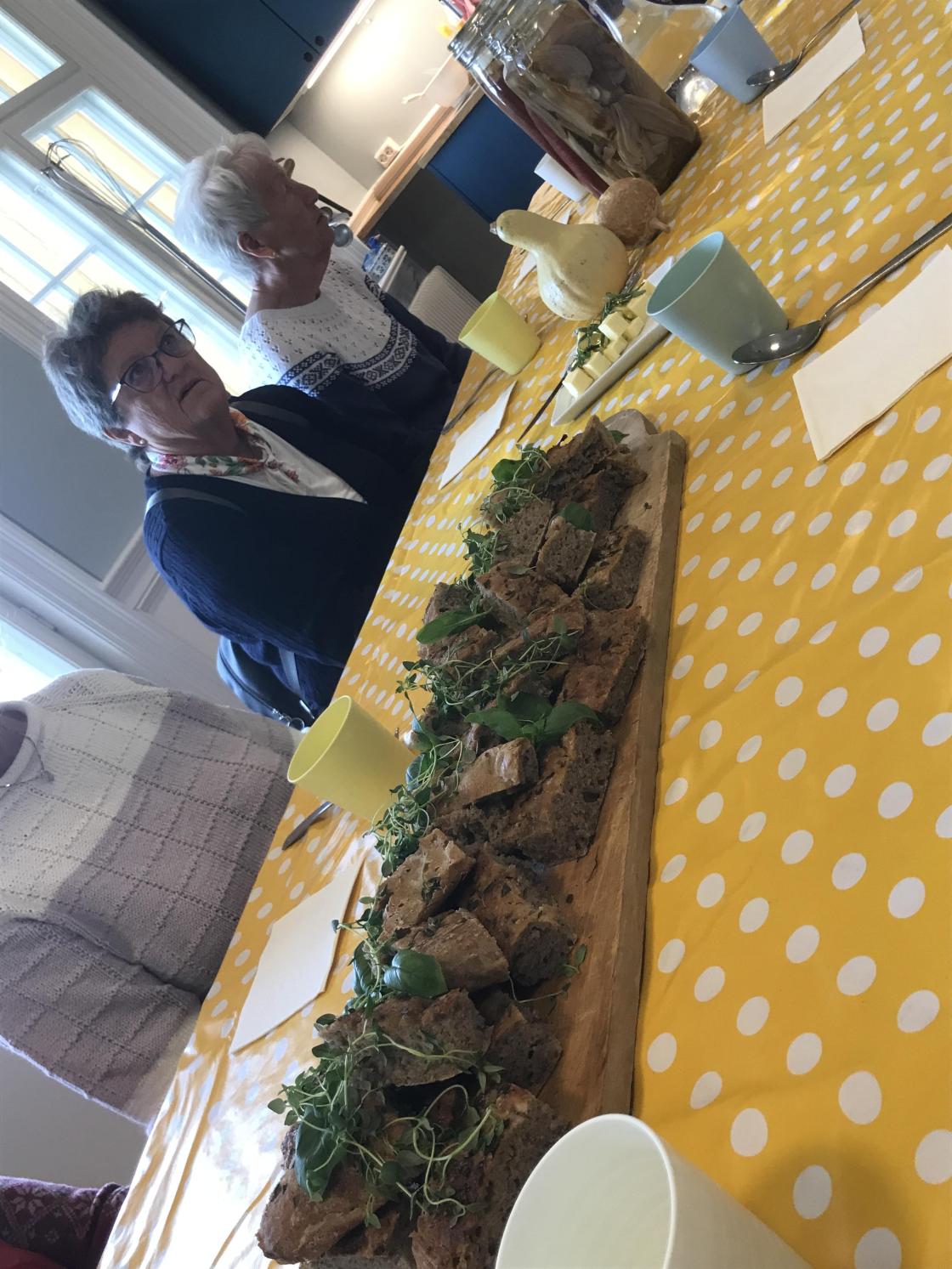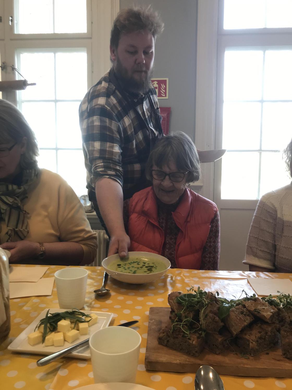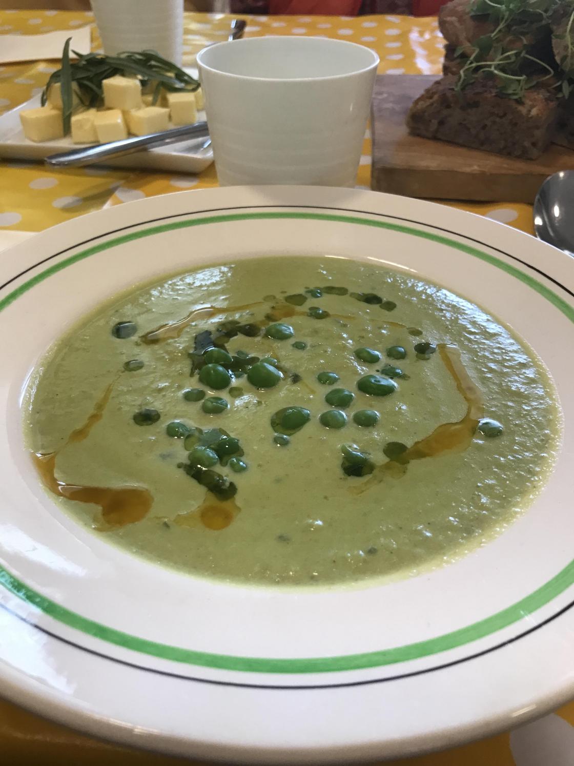 Vi fikk servert grønn ertesuppe laget på norske grønne erter, ramsløk, kraft og fløte med en dash chili. Deilig bygg og rug foccia til!