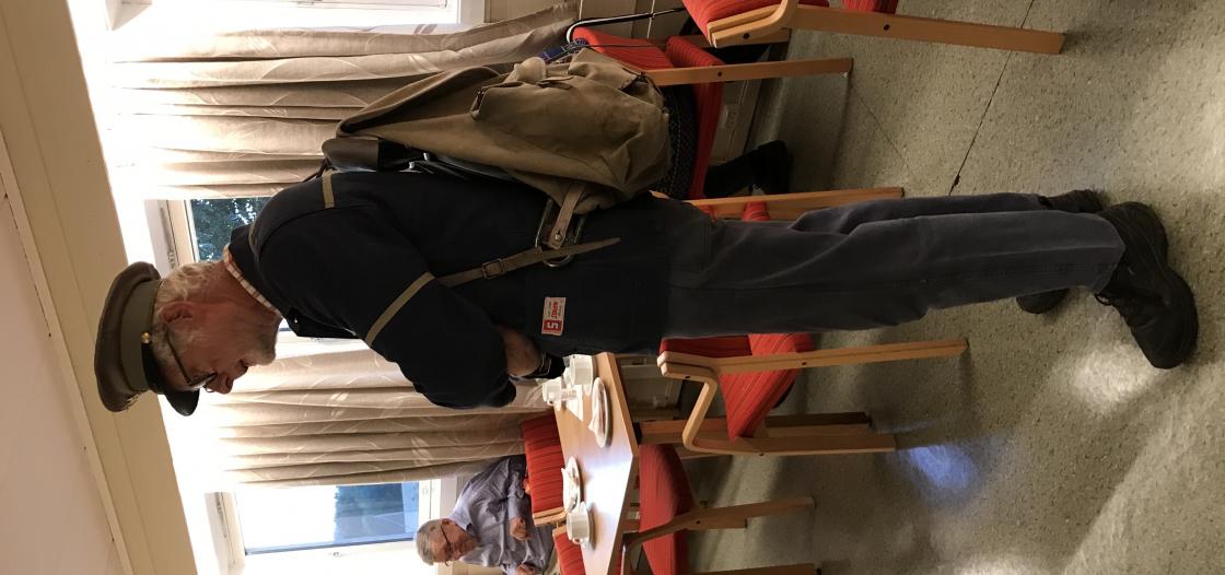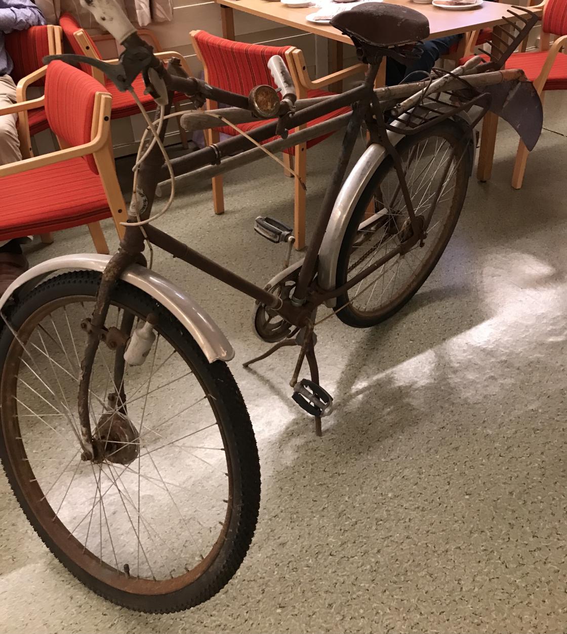 Leder Jorunn Kjærnes ønsket 19 stk velkommen og mer ble ikke sagt før "Veiviseren" kom trillende inn i lokalet med sin godt brukte sykkel og spade og hakke... Han hilste de gamle kjerringene og presenterte seg som Anton Slurebakken. Ble nok overrasket over forsamlingen som også besto av noen menn. Han fortalte mangt og meget om et slitsomt liv som veivokter. Mange stikkrenner og humper var ordnet i hans tid. Og brøytepinner - noe han fremdeles advarte oss om å ta i bruk på egne turer.... Flere av historiene om de "late" veiarbeiderne ble gjenfortalt - innpakket i egne fortellinger. Som at tresko var ubrukelig, da de kunne slå rot 😂. Han hadde forstått etter bare ei uke at spaden var sveiset fast av smedens læregutt. Det var mye klage på veien i Gregershølet og ellers. Lastebilen skranglet så gebisset ble lagt i hanskerommet -, men da ble vognkortet eti opp 🤣😲. Flere gode historier fulgte, men jeg oppfordrer heller til å møte opp når vedkommende skal være gjest.